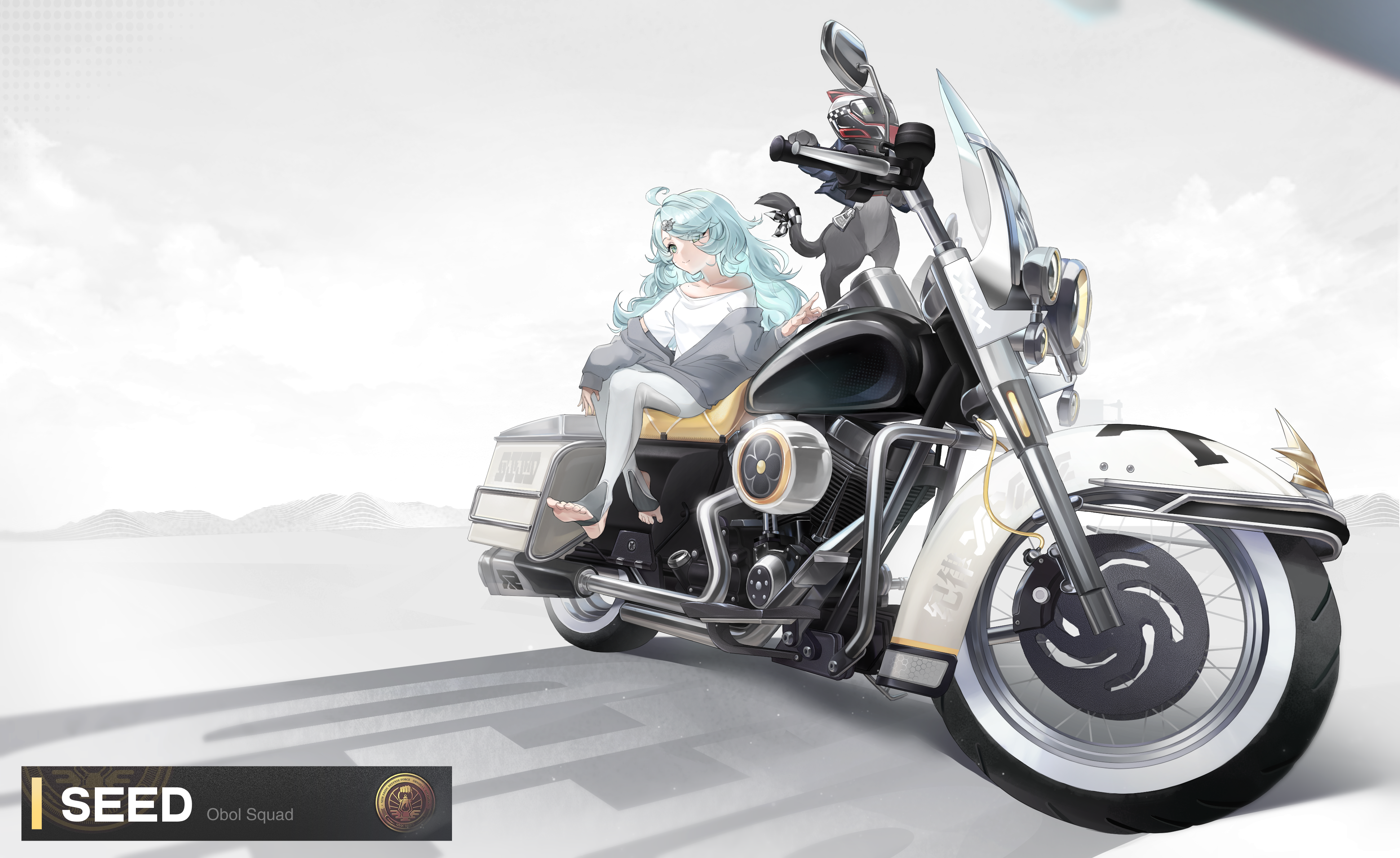1girl 1other absurdres animal bare_shoulders blue_eyes blue_hair cat feet formal_clothes grey_jacket hair_ornament hairpin helmet highres jacket latex latex_pants mole mole_on_shoulder motor_vehicle motorcycle motorcycle_helmet on_motorcycle pants qingkefu_yixia seed_(zenless_zone_zero) shirt sitting suit tail tail_wrap toeless_socks toes white_background white_shirt white_suit zenless_zone_zero
