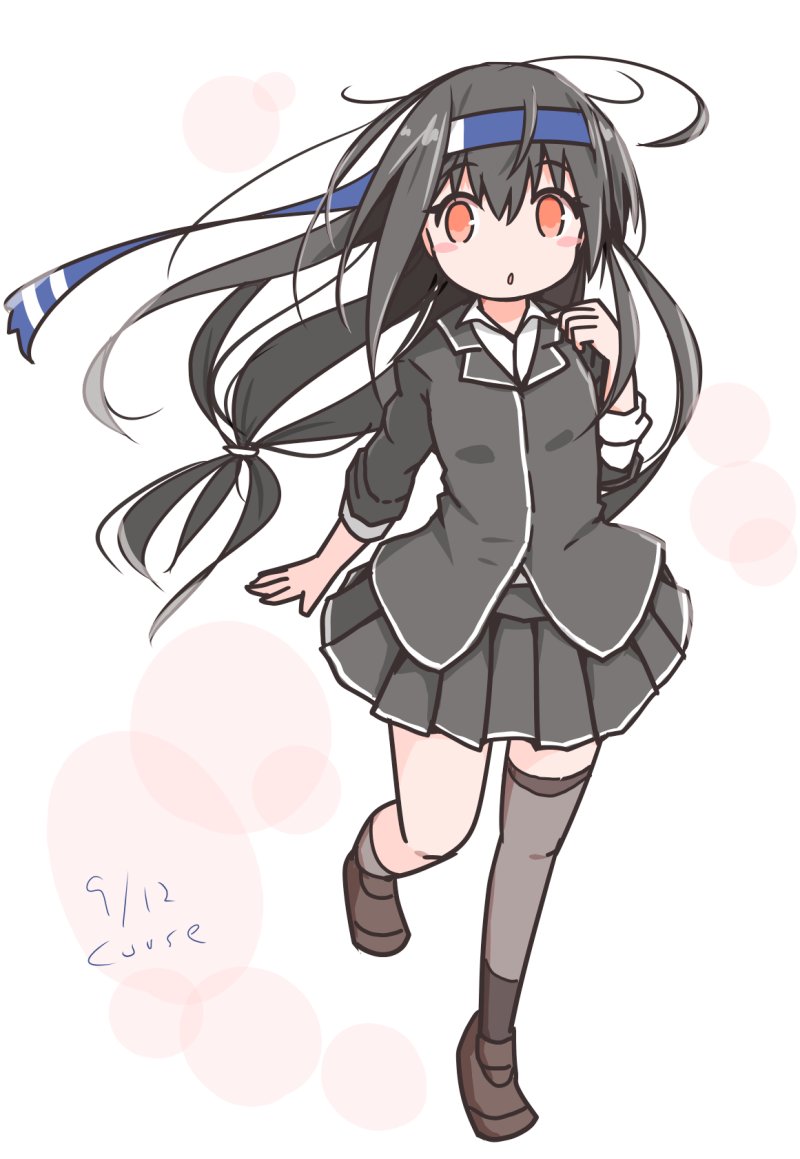 1girl asymmetrical_legwear black_hair black_jacket black_skirt blue_headband collared_shirt curse_(023) dress_shirt full_body grey_thighhighs hatsushimo_(kancolle) hatsushimo_kai_ni_(kancolle) headband jacket kantai_collection kneehighs long_hair looking_at_viewer low-tied_long_hair orange_eyes pleated_skirt school_uniform shirt single_kneehigh single_sock single_thighhigh skirt socks solo thighhighs uneven_legwear white_shirt