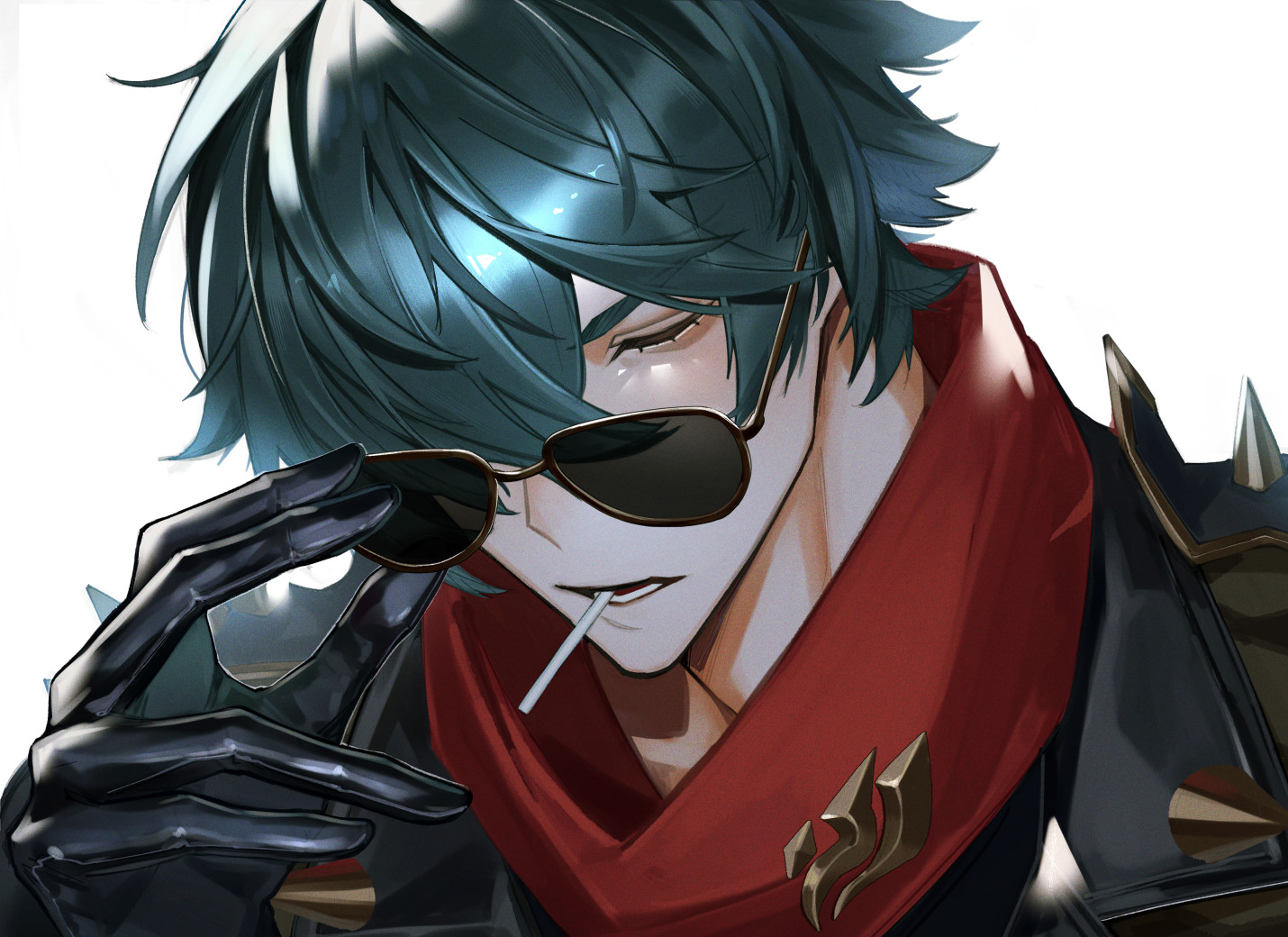 1boy bf2xuec6ow98466 black_jacket green_hair jacket leather leather_jacket lighter_(zenless_zone_zero) looking_down red_scarf scarf short_hair shoulder_spikes solo spiked_jacket spikes stick studded_gloves sunglasses white_background zenless_zone_zero