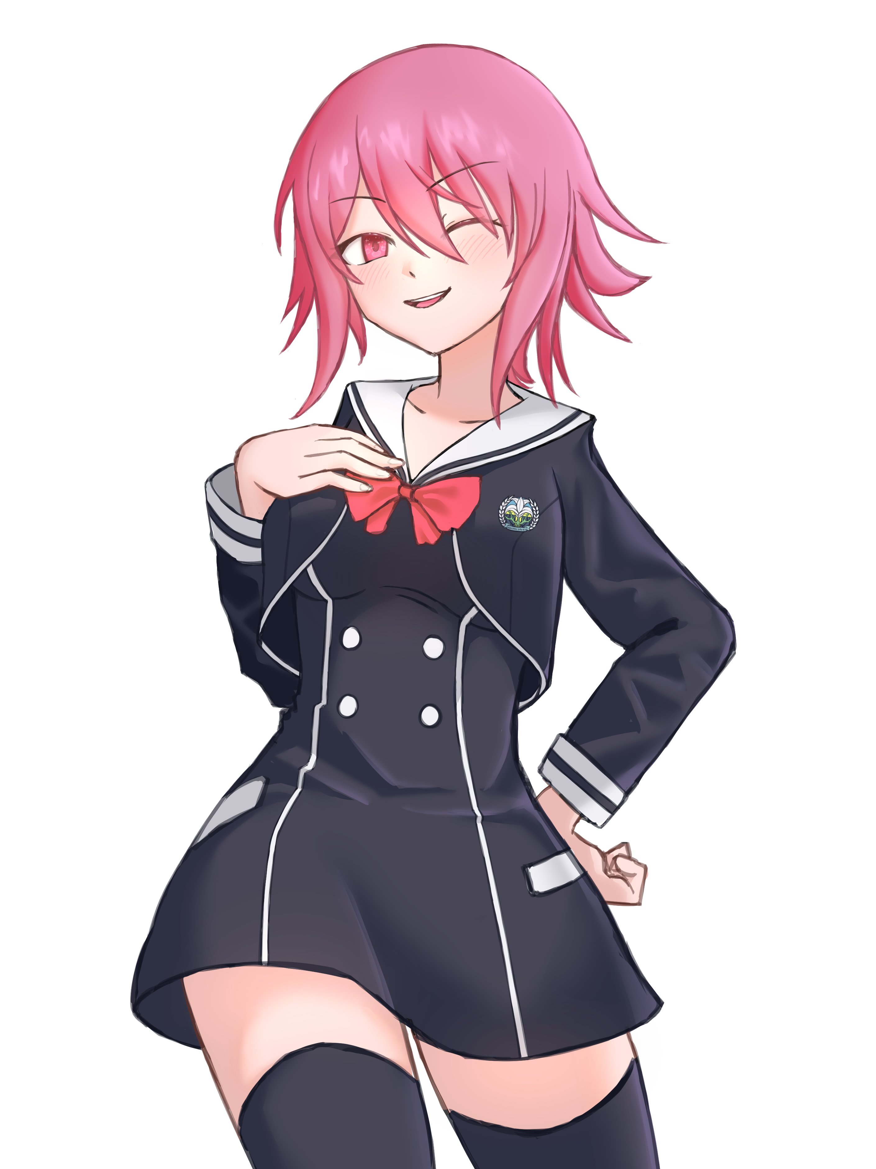 1girl absurdres black_thighhighs bow breasts buttons chaos;child chest_bow dress dress_vest hand_on_own_chest hand_on_own_hip hekiho_academy_school_uniform highres long_sleeves medium_breasts one_eye_closed onoe_serika open_mouth pink_eyes pink_hair school_emblem school_uniform science_adventure short_hair_with_long_locks simple_background smile solo teeth thighhighs thighs tongue turnipdish upper_teeth_only white_background