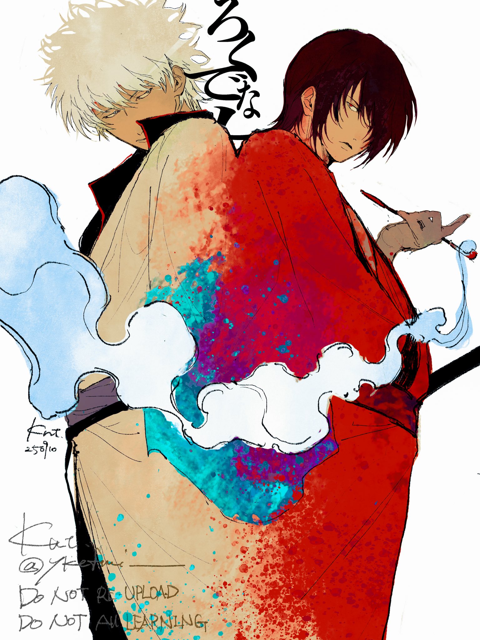 2boys back-to-back brown_hair closed_mouth dated gintama hadanugi_dousa hair_over_one_eye highres holding holding_smoking_pipe japanese_clothes kimono kiseru long_sleeves looking_at_viewer male_focus messy_hair multiple_boys open_kimono popped_collar red_eyes red_kimono red_sash sakata_gintoki sash sheath sheathed signature smoke smoking smoking_pipe sword takasugi_shinsuke weapon white_background white_hair white_kimono wide_sleeves ykefmi