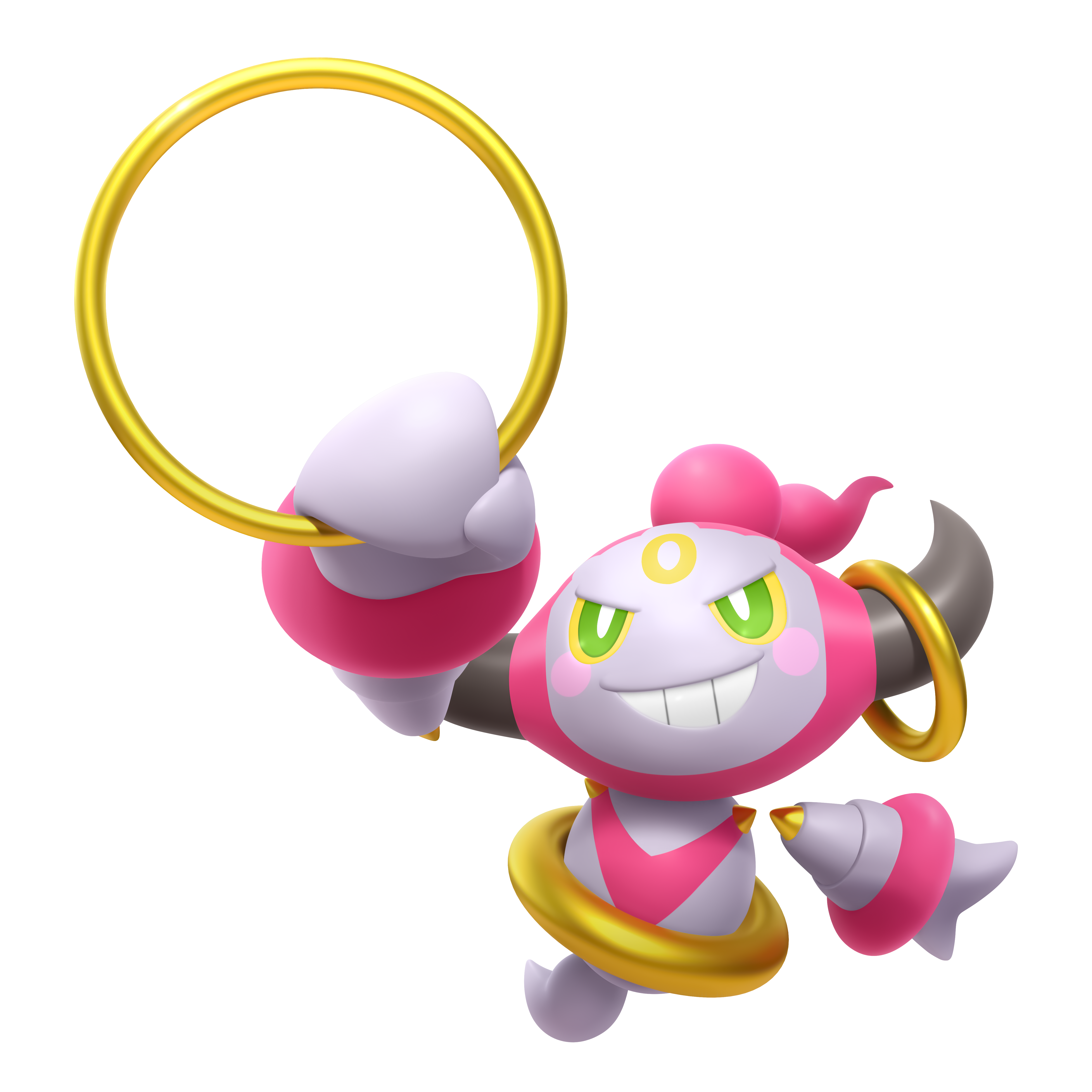 3d absurdres arm_up artist_request bright_pupils colored_sclera full_body gen_6_pokemon green_eyes grin highres holding hoopa hoopa_(confined) horns legendary_pokemon mythical_pokemon nintendo official_art outline pokemon pokemon_(creature) pokemon_focus pokemon_legends:_z-a rayman_limbs second-party_source smile solo teeth transparent_background white_outline white_pupils yellow_sclera