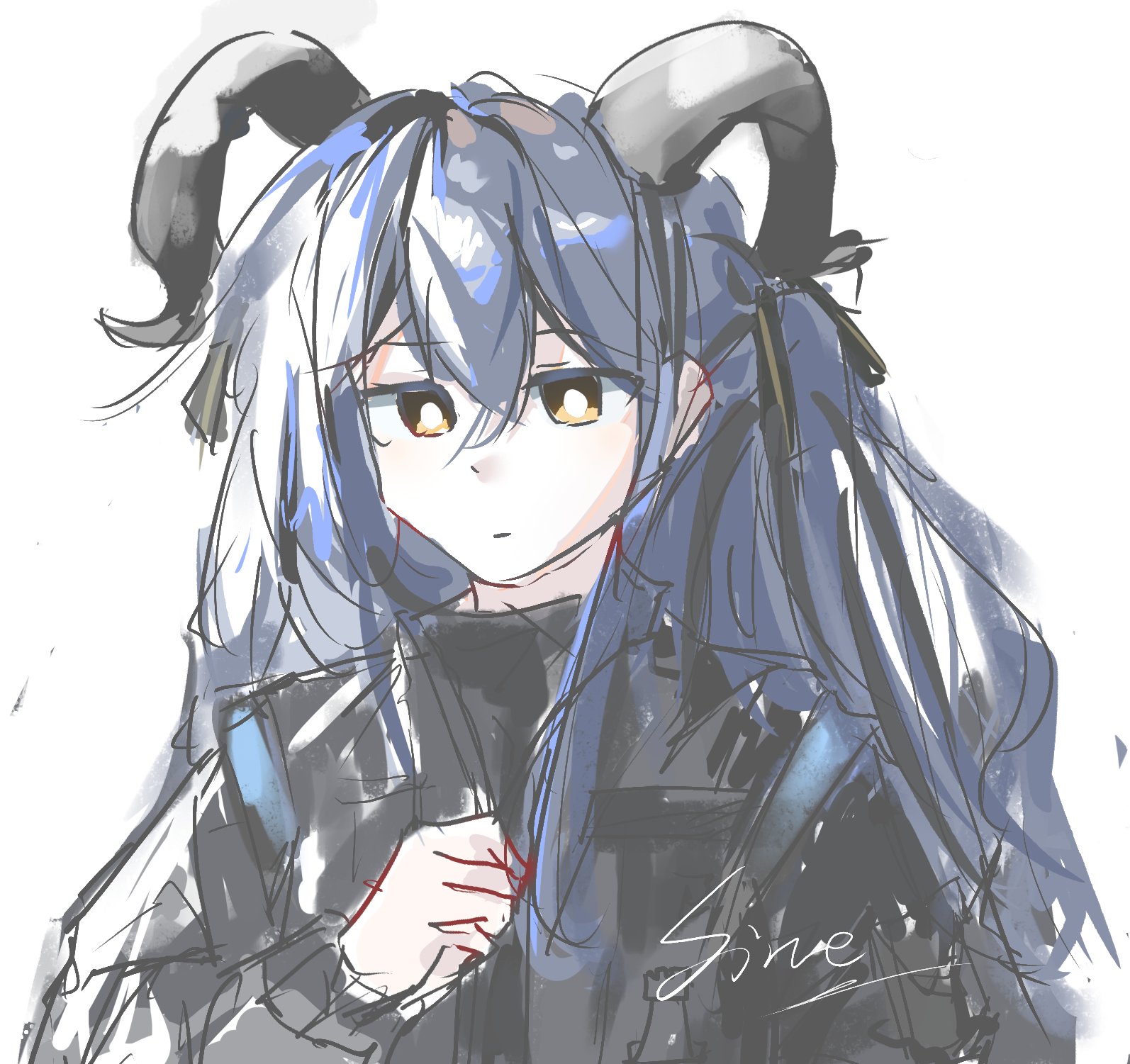 1girl arknights bang_dream! bang_dream!_it's_mygo!!!!! black_jacket blue_hair chinese_commentary closed_mouth commentary_request hair_between_eyes highres horns jacket long_hair simple_background sine_sinian solo togawa_sakiko togawa_sakiko_(master_of_melodia) upper_body white_background yellow_eyes