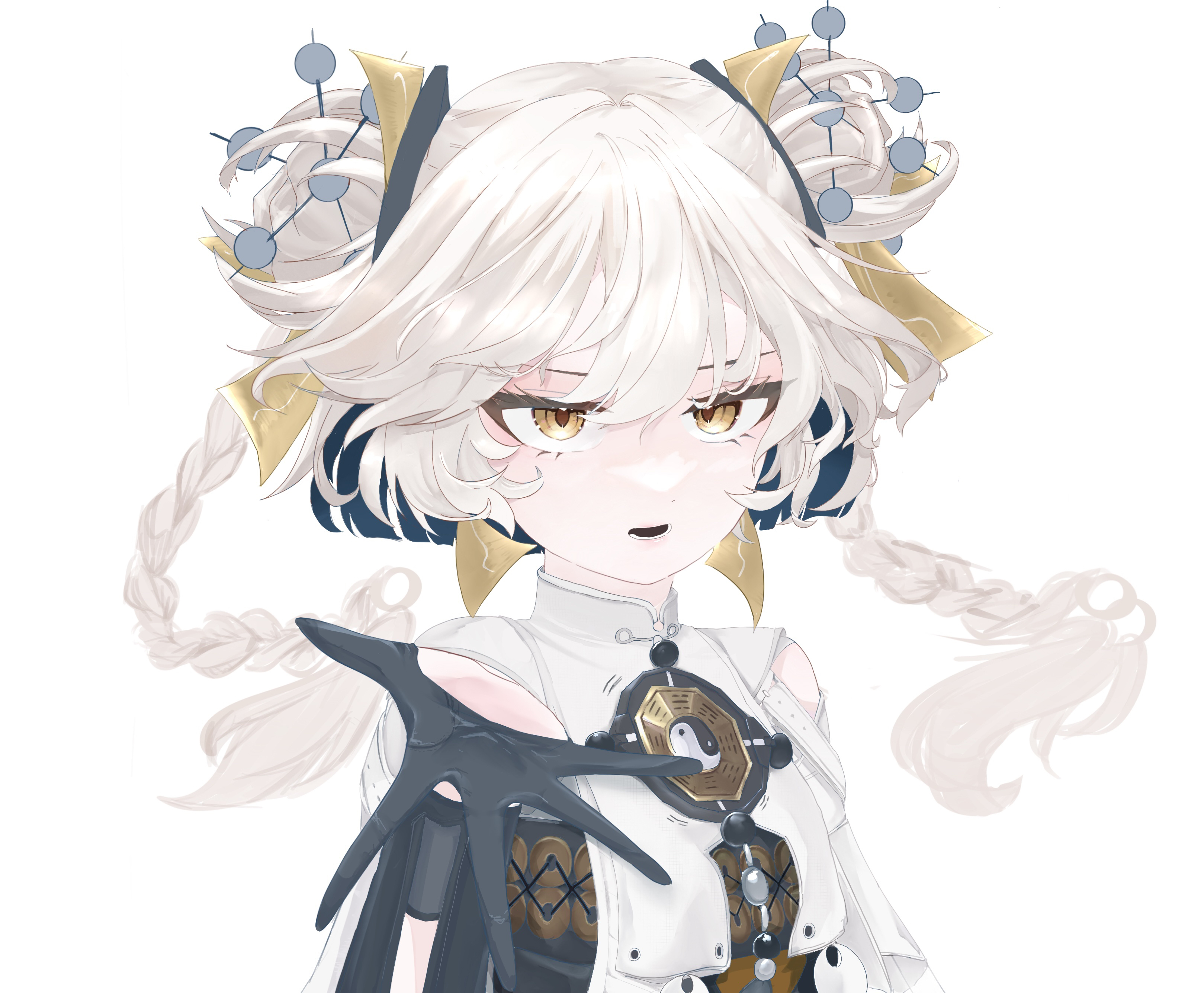 1girl absurdres black_dress black_gloves braid braided_twintails china_dress chinese_clothes double_bun dress earrings gloves hair_between_eyes hair_bun highres jewelry karenina:_scire_(warding_ritualist)_(pgr) karenina_(pgr) leeum8s open_mouth orange_eyes punishing:_gray_raven solo white_dress
