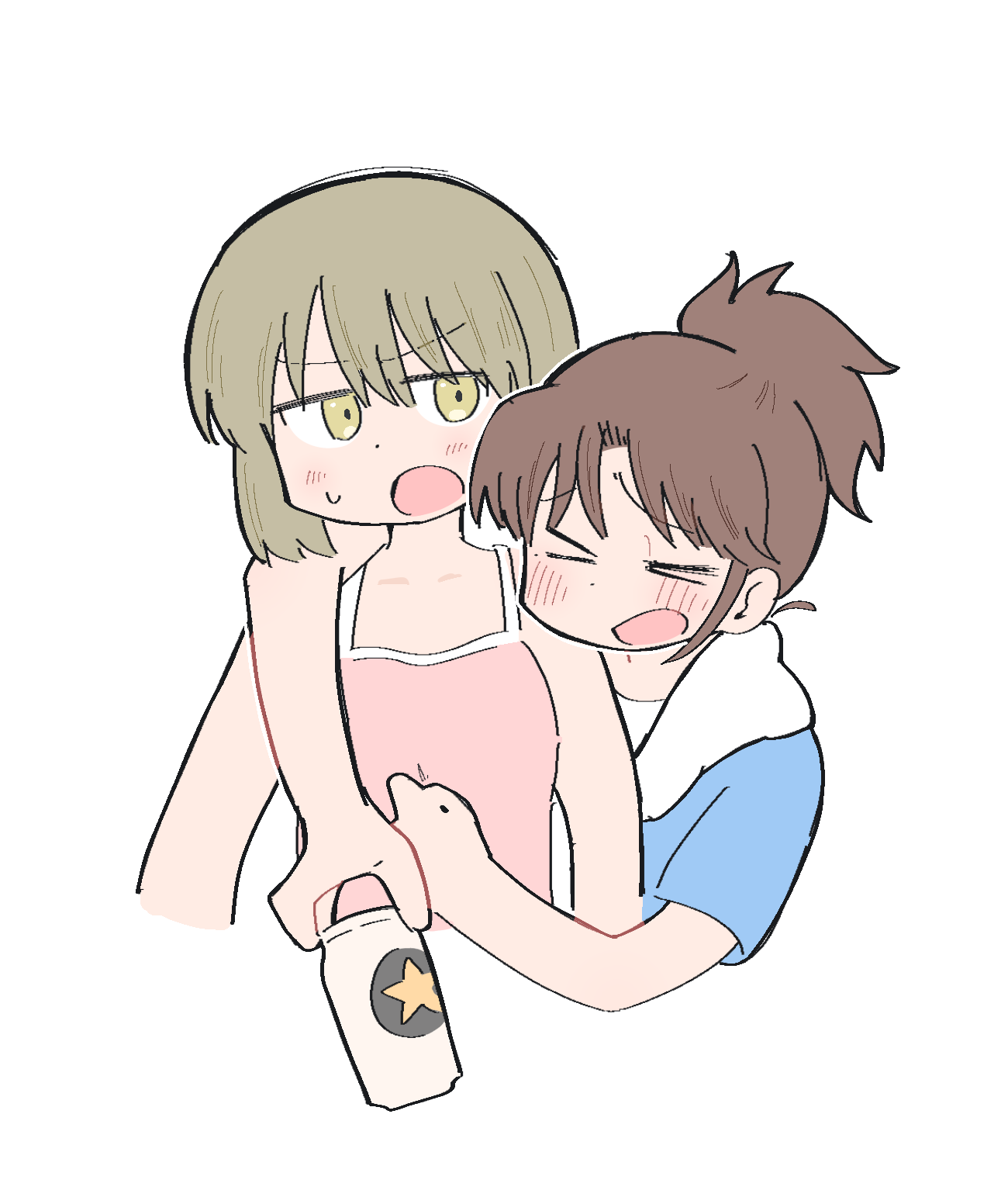 >_< 2girls niikura_(city) blonde_hair blue_hoodie blush brown_hair camisole can city_(arawi_keiichi) collarbone cropped_torso green_eyes highres holding holding_can hood hood_down hoodie jitome looking_at_another medium_hair multiple_girls nagumo_midori open_mouth pink_camisole ponytail shirt sidelocks simple_background small_sweatdrop white_background white_shirt wichimi