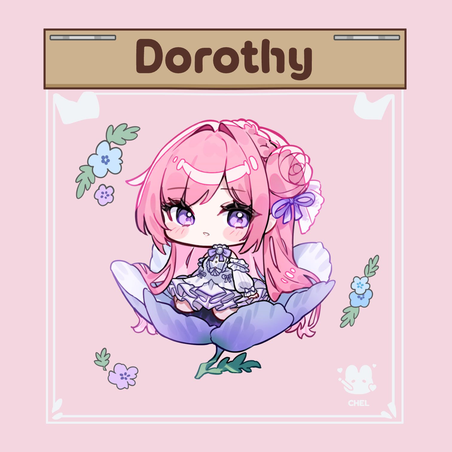 1girl blue_flower blush_stickers bow braid character_name cheli_(kso1564) chibi commentary_request dorothy_(nikke) dress flower goddess_of_victory:_nikke hair_bun hair_intakes hair_ribbon highres long_hair long_sleeves looking_at_viewer parted_lips pink_background pink_hair puffy_long_sleeves puffy_sleeves purple_bow purple_eyes purple_ribbon ribbon single_side_bun sitting sleeves_past_wrists solo very_long_hair white_dress