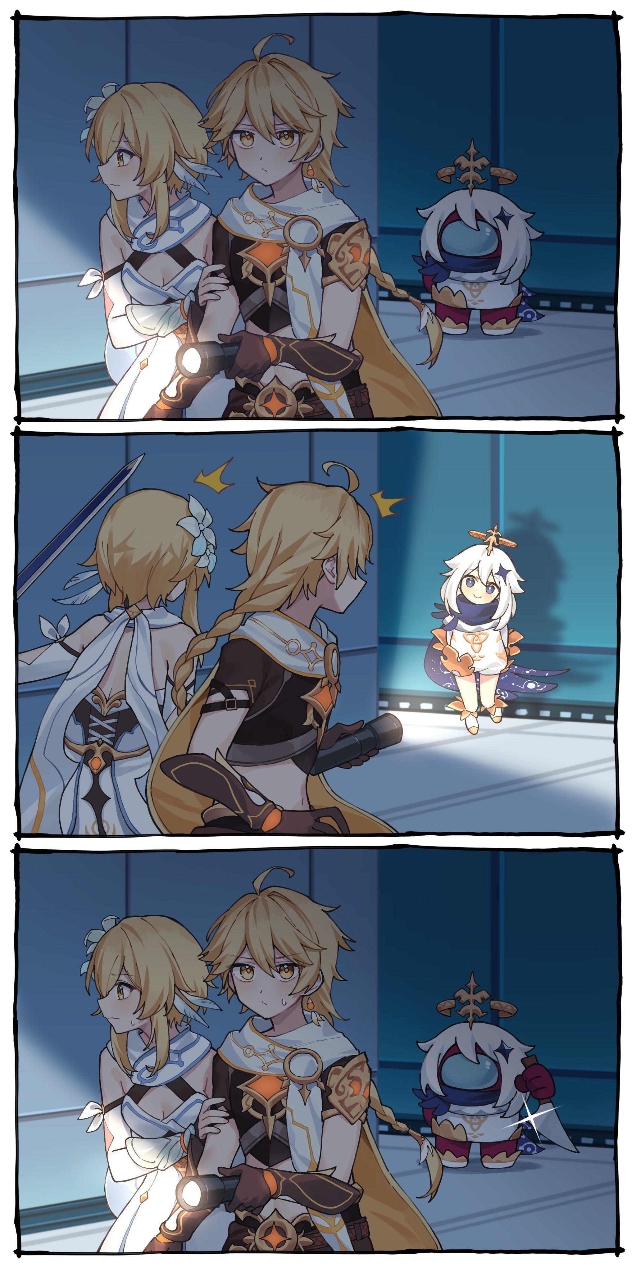 1boy 1girl absurdres aether_(genshin_impact) blonde_hair braid breasts dress genshin_impact gloves hair_between_eyes highres long_hair low-braided_long_hair low-tied_long_hair lumine_(genshin_impact) paimon_(genshin_impact) short_hair tsukino_(nakajimaseiki) yellow_eyes