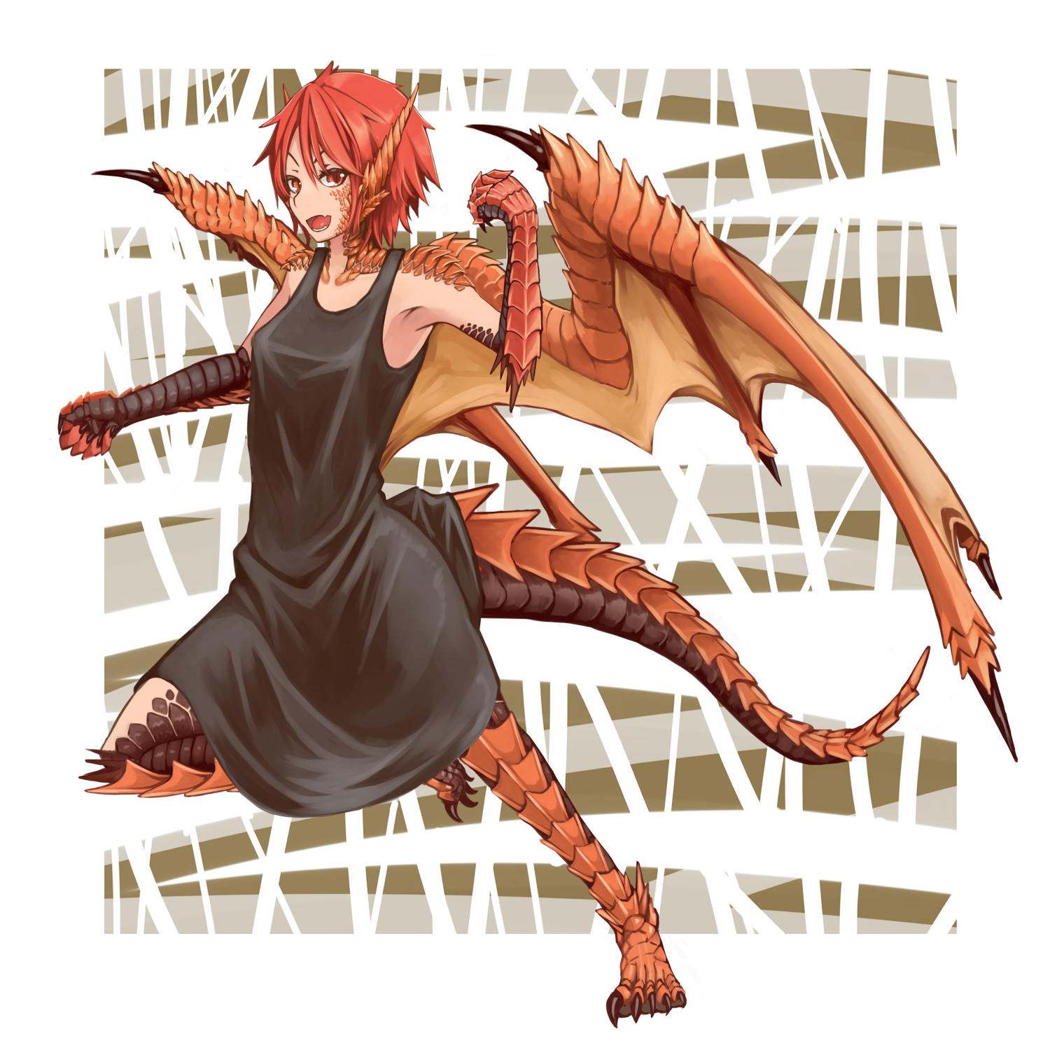 1girl black_dress breasts claws dragon_girl dress highres hitokuirou original red_eyes scales small_breasts smile solo solo_vivace_(hitokuirou) tail wings