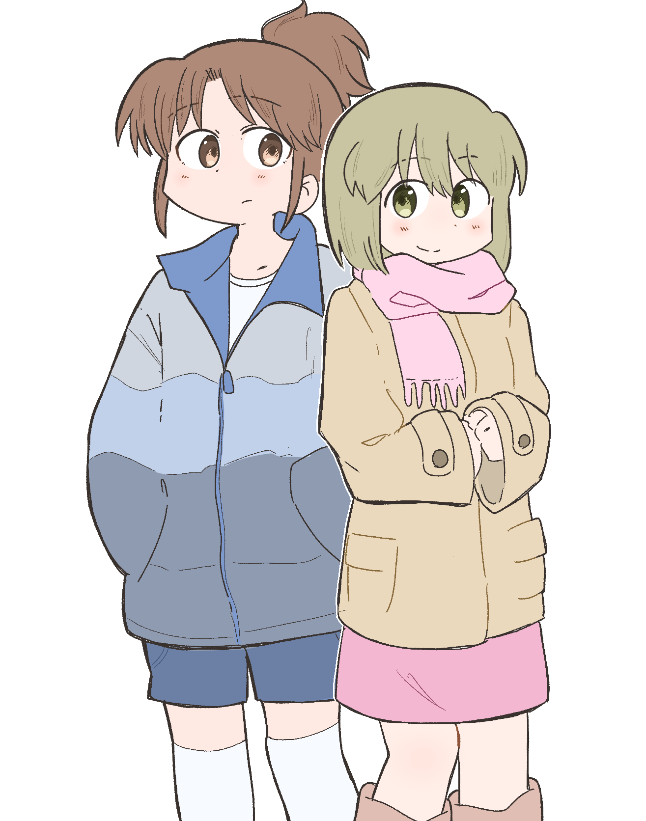 2girls alternate_costume niikura_(city) blonde_hair blue_jacket blue_shorts boots brown_boots brown_eyes brown_hair city_(arawi_keiichi) closed_mouth coat collarbone dot_nose green_eyes hands_in_pockets highres jacket looking_at_another looking_at_viewer medium_hair multiple_girls nagumo_midori pink_scarf pink_skirt pocket ponytail scarf shirt short_hair shorts simple_background skirt socks white_background white_shirt white_socks wichimi wide_sleeves yellow_coat