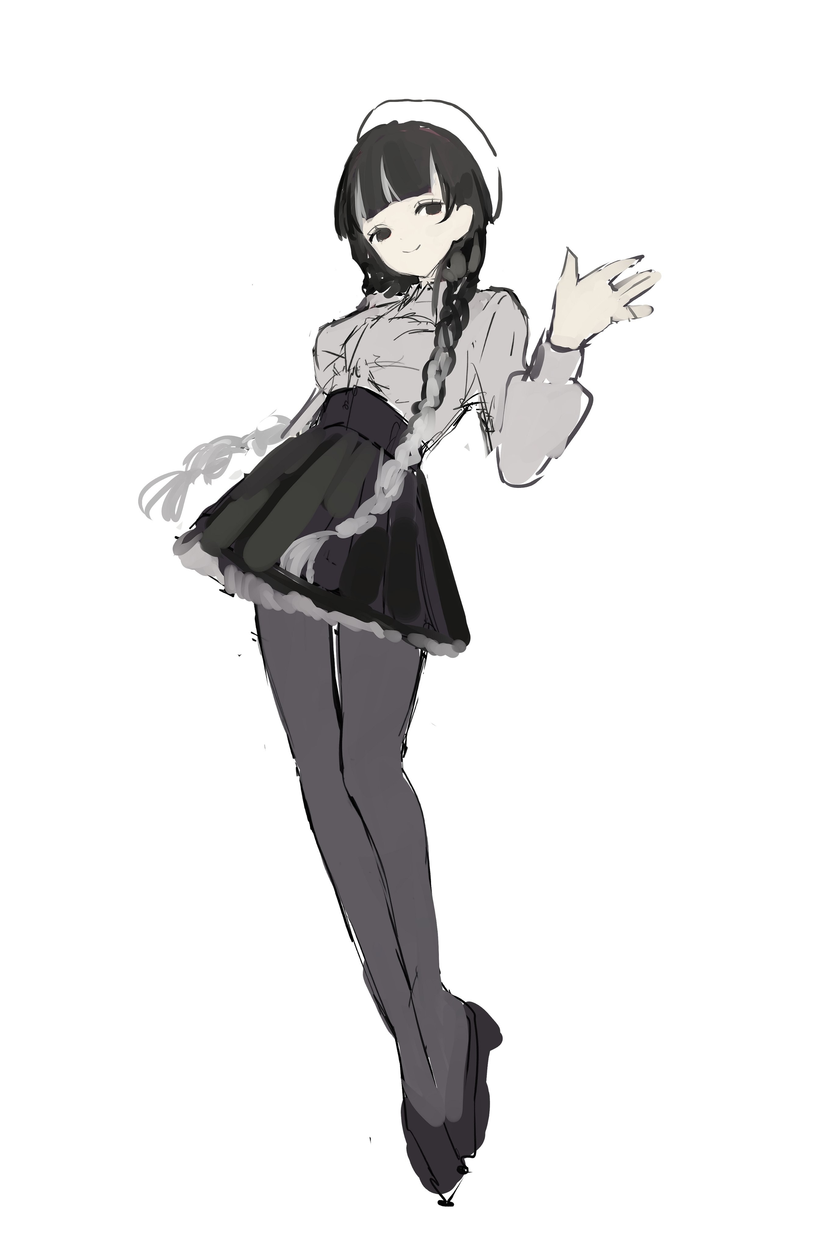 1girl absurdres black_eyes black_hair braid breasts full_body highres large_breasts long_hair long_sleeves looking_at_viewer monochrome original pantyhose skirt smile solo toke_ino twin_braids unfinished