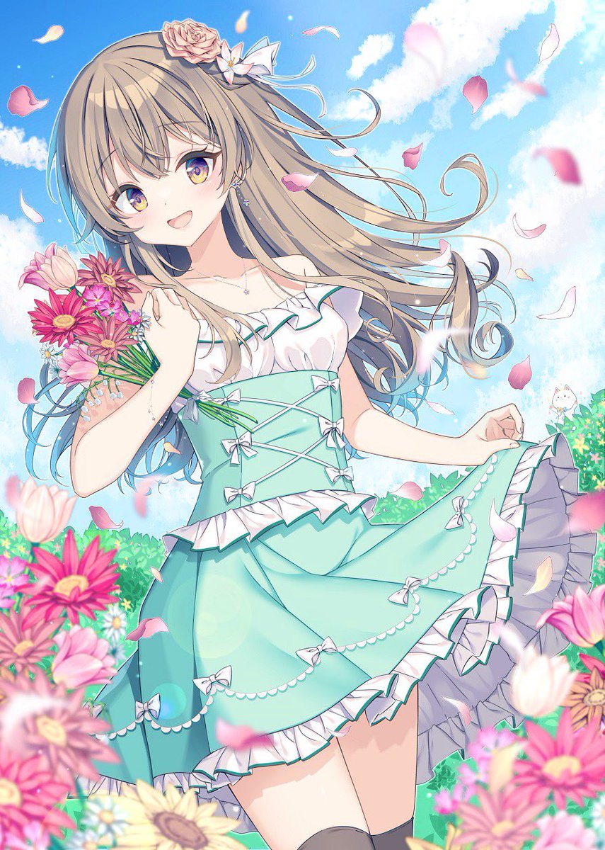 1girl :d bare_shoulders blue_sky blurry blurry_foreground bouquet breasts brown_hair cloud collarbone day depth_of_field dress flower frills highres holding holding_bouquet long_hair looking_at_viewer mizuki_yuuma off-shoulder_dress off-shoulder_shirt off_shoulder open_mouth original outdoors petals pink_flower red_flower shirt skirt sky smile solo very_long_hair white_flower white_shirt yellow_flower