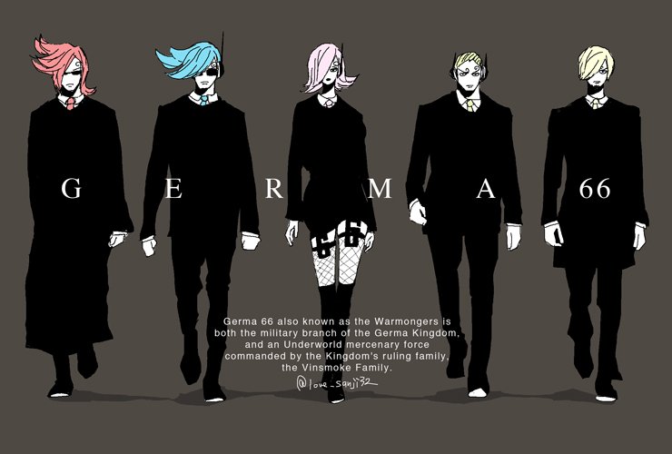 1girl 4boys blonde_hair blue_hair boots brother_and_sister commentary_request curly_eyebrows facial_hair fishnet_thighhighs fishnets formal_clothes goatee grey_background hair_over_one_eye medium_hair multiple_boys one_piece pink_hair sanji_(one_piece) short_hair siblings suit sunglasses szlove thighhighs vinsmoke_ichiji vinsmoke_niji vinsmoke_reiju vinsmoke_yonji walking