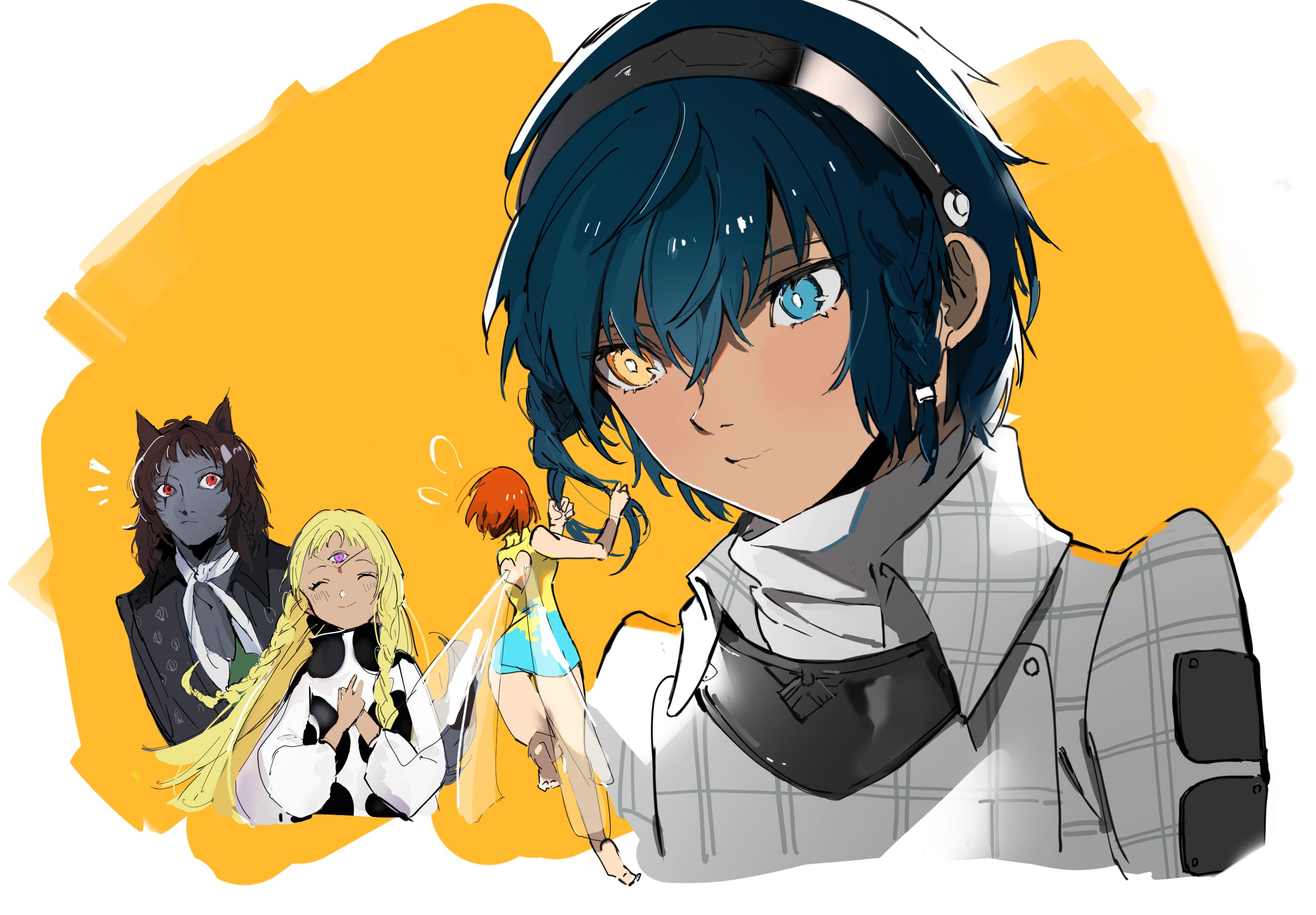 2boys 2girls animal_ears basilio_(metaphor:_refantazio) black_hairband black_jacket blonde_hair blue_eyes blue_hair blush braid brown_hair closed_eyes closed_mouth commentary_request dark-skinned_female dark_skin eupha_(metaphor:_refantazio) fairy fairy_wings flying_sweatdrops gallica_(metaphor:_refantazio) hairband heterochromia highres jacket leotard long_hair looking_at_another metaphor:_refantazio mina_(mina_st4r) mini_person minigirl multiple_boys multiple_girls orange_hair poncho protagonist_(metaphor:_refantazio) purple_eyes red_eyes scar scar_across_eye scar_on_face short_hair size_difference third_eye twin_braids white_jacket wings yellow_eyes
