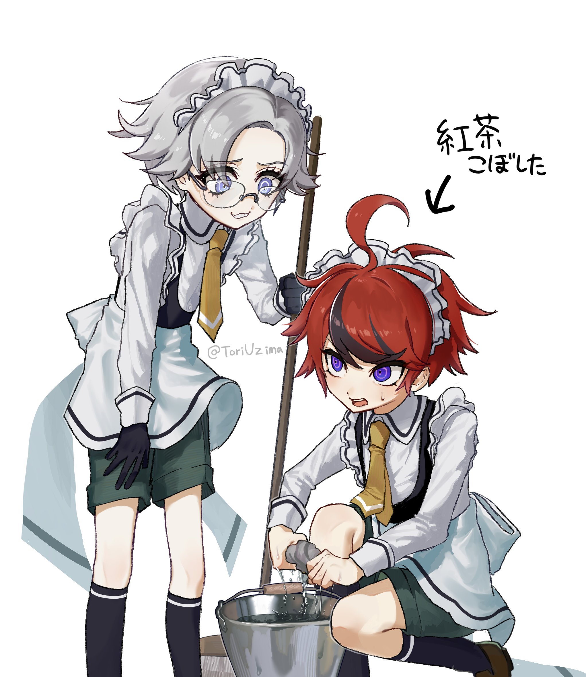 2boys ahoge alternate_costume aotsuki_eito apron arrow_(symbol) black_hair black_socks blue_eyes brown_shoes bucket collared_shirt commentary_request crossdressing crossdressing_(mtf) enmaided eyelashes glasses green_shorts grey_hair grin hand_on_own_thigh highres holding holding_cloth holding_mop kneehighs maid male_focus male_maid mop multicolored_hair multiple_boys necktie open_mouth red_hair shirt shoes short_hair shorts simple_background smile socks streaked_hair sumino_takumi sweat teeth the_hundred_line_-last_defense_academy- toriuzima tsurime twitter_username two-tone_hair upper_teeth_only white_apron white_background white_shirt wringing yellow_necktie