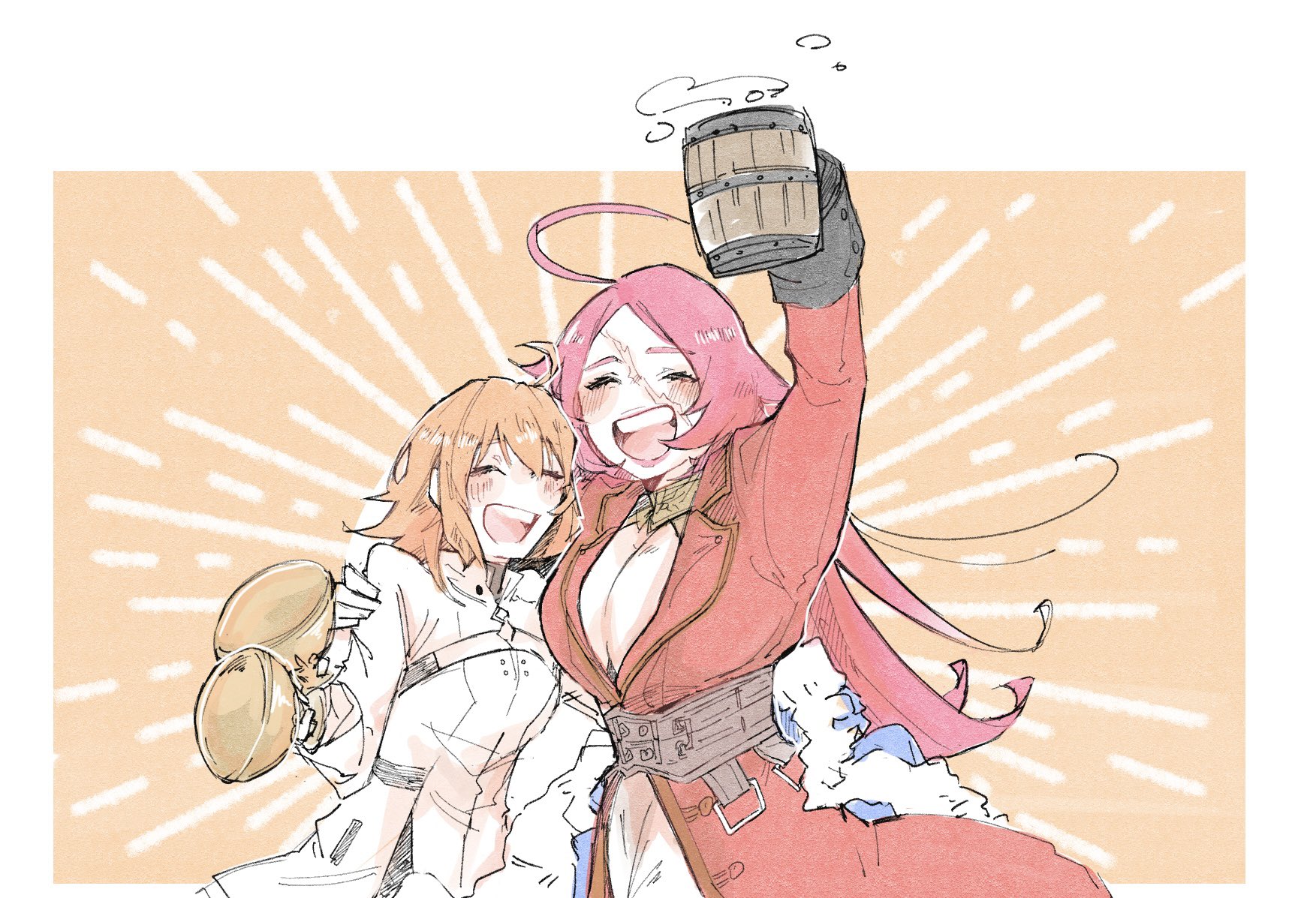 2girls ahoge beer_mug belt breasts cleavage closed_eyes coat cup dng_wgs dress fate/grand_order fate_(series) francis_drake_(fate) fujimaru_ritsuka_(female) fujimaru_ritsuka_(female)_(decisive_battle_chaldea_uniform) highres holy_grail_(fate) large_breasts long_hair mug multiple_girls orange_background orange_hair pink_hair red_coat white_dress