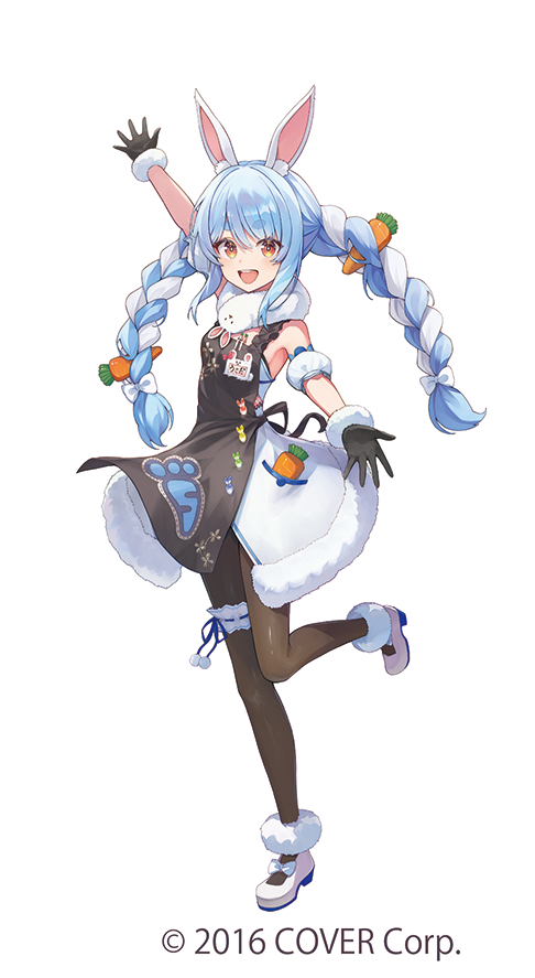 1girl :d animal_ear_fluff animal_ears ankle_garter atatatatame01 black_gloves black_pantyhose blue_hair breasts coat coat_dress colored_shoe_soles commentary_request copyright_notice detached_sleeves don-chan_(usada_pekora) dress frilled_thigh_strap full_body fur-trimmed_coat fur-trimmed_gloves fur_scarf fur_trim gloves hikimayu hololive long_hair looking_at_viewer mary_janes multicolored_hair official_art open_mouth orange_eyes outstretched_arms pantyhose puffy_detached_sleeves puffy_short_sleeves puffy_sleeves rabbit-shaped_pupils rabbit_ears rabbit_girl scarf shoes short_eyebrows short_sleeves sidelocks small_breasts smile solo standing standing_on_one_leg symbol-shaped_pupils teeth thick_eyebrows thigh_strap two-tone_hair upper_teeth_only usada_pekora usada_pekora_(1st_costume) virtual_youtuber white_coat white_hair white_scarf white_shoes white_sleeves