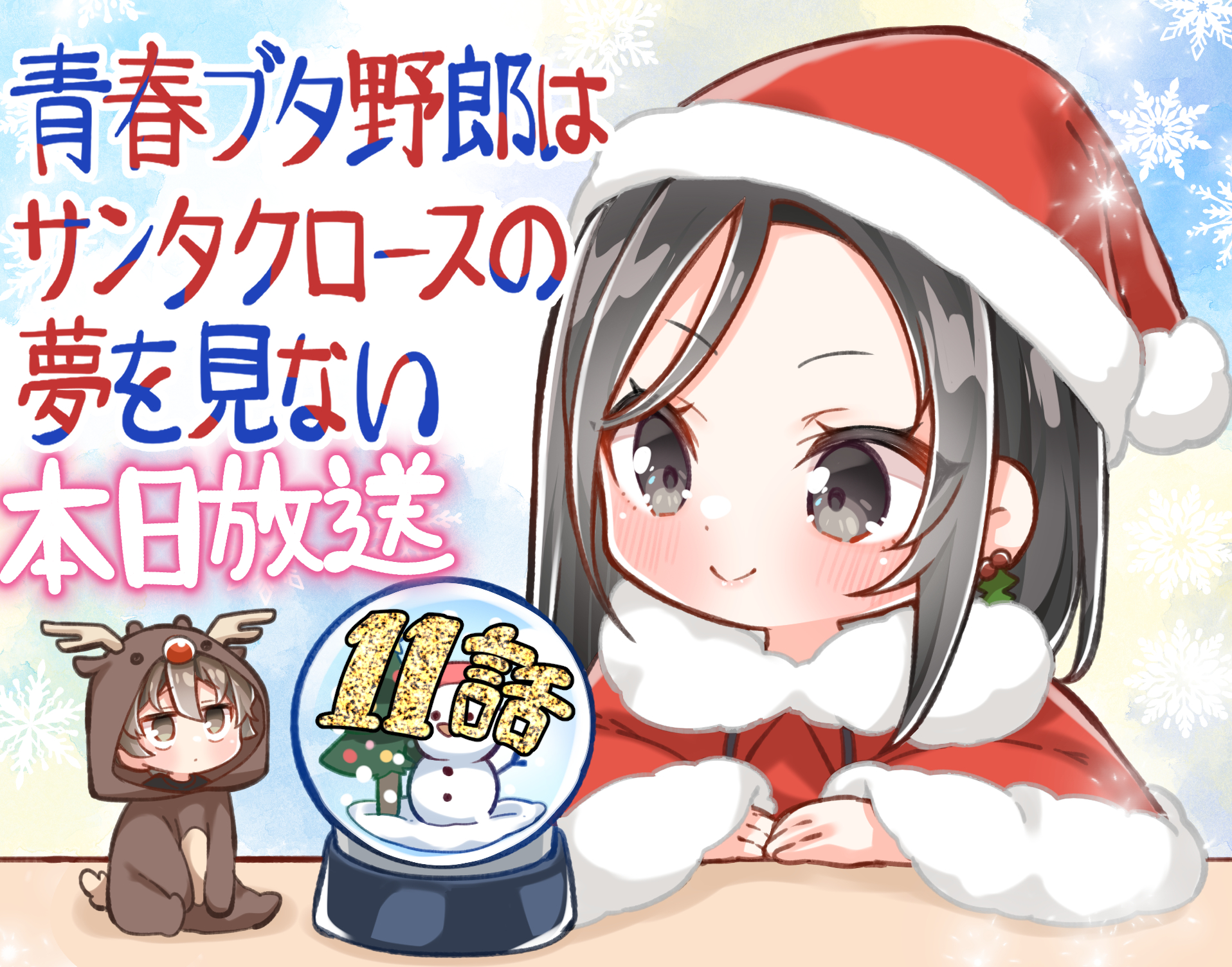 >:) 1boy 1girl animal_costume animal_hood antlers azusagawa_sakuta black_hair blush brown_eyes brown_hair capelet closed_mouth commentary_request fake_antlers forehead fur-trimmed_capelet fur-trimmed_headwear fur_trim grey_hair hat highres hood hood_up horns jako_(jakoo21) kirishima_touko long_hair mini_person miniboy red_capelet red_hat reindeer_antlers reindeer_costume santa_hat seishun_buta_yarou sitting smile snow_globe snowman translation_request v-shaped_eyebrows