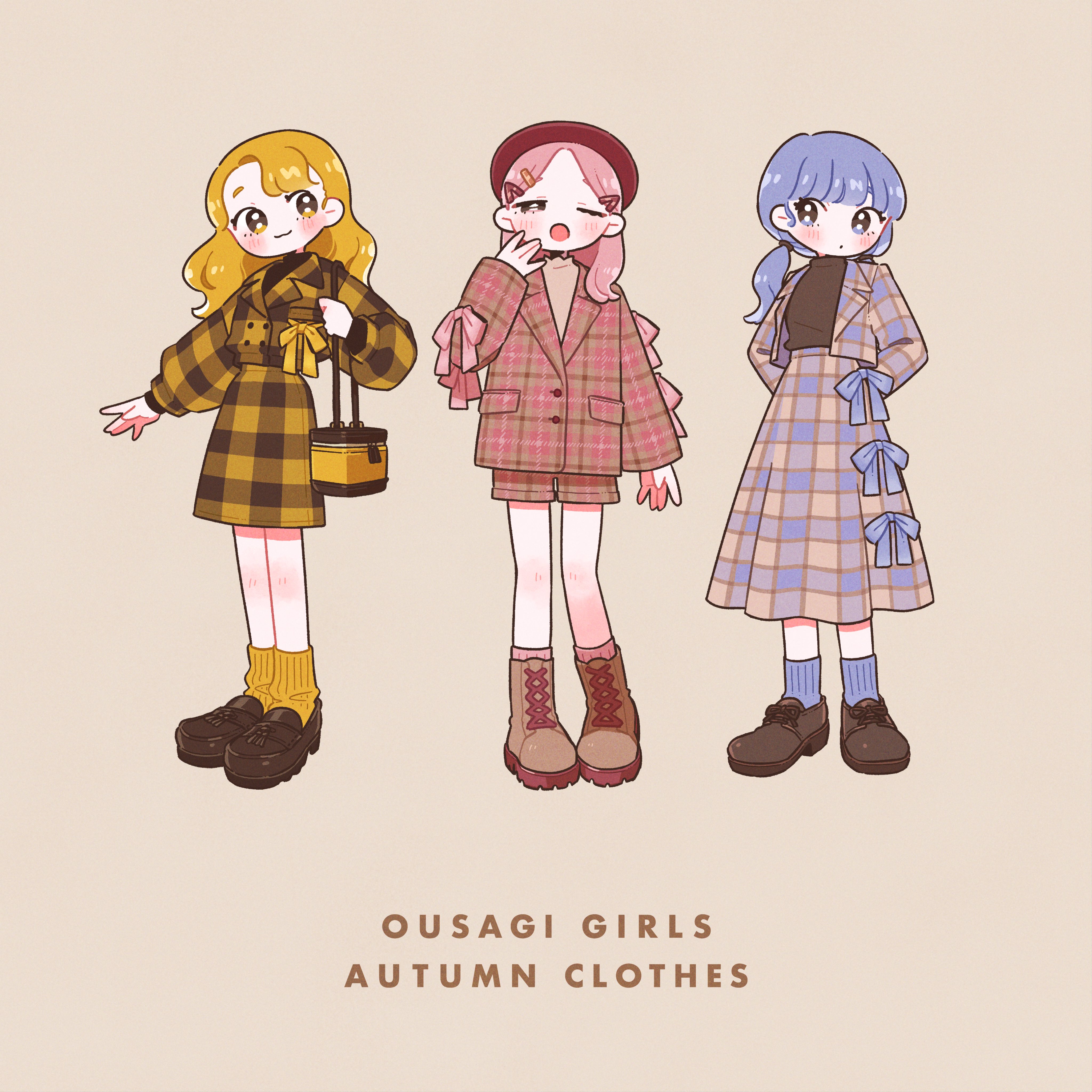 3girls :3 absurdres arms_behind_back bag black_shoes black_sweater blonde_hair blue_eyes blue_hair blue_jacket blue_ribbon blue_skirt blue_socks blush boots brown_boots brown_jacket brown_shorts closed_mouth commentary english_text expressionless full_body grey_background hair_ornament hairclip hat highres jacket keke_(kotowari) lace-up_boots lapels long_hair long_skirt long_sleeves multiple_girls notched_lapels open_mouth original parted_lips pink_eyes pink_hair pink_ribbon pink_socks plaid_clothes plaid_jacket plaid_skirt red_hat ribbed_socks ribbon shoes shorts shoulder_bag simple_background skirt smile socks sweater untranslatable_commentary turtleneck turtleneck_sweater twintails yellow_bag yellow_eyes yellow_jacket yellow_ribbon yellow_skirt yellow_socks