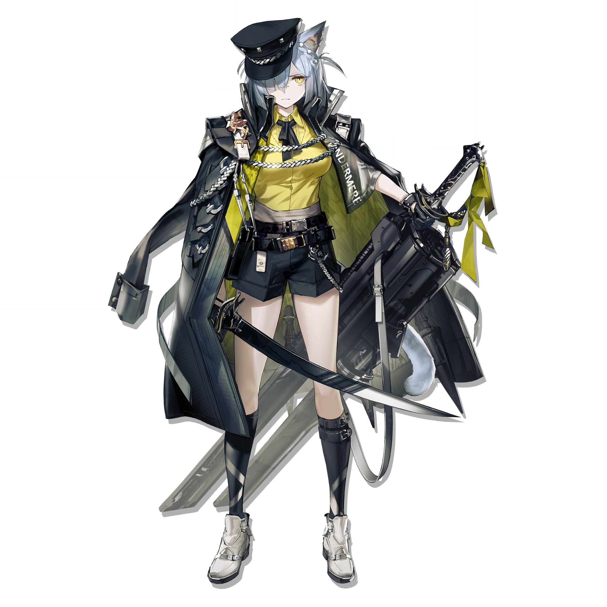 1girl animal_ears arknights belt_pouch black_bow black_bowtie black_coat black_gloves black_hat black_shorts black_socks blue_hair bow bowtie braid cat_ears cat_girl cat_tail cenm0 closed_mouth coat coat_on_shoulders delphine_(arknights) dual_wielding full_body gloves hair_over_one_eye half_gloves hat highres holding holding_sword holding_weapon kneehighs military_coat military_hat official_art one_eye_covered open_clothes open_coat pearl_hair_ornament pouch scabbard sheath shin_belt shirt shoes short_hair shorts simple_background socks solo standing sword tachi-e tail third-party_source transparent_background two_side_up unsheathed weapon white_shoes yellow_eyes yellow_shirt