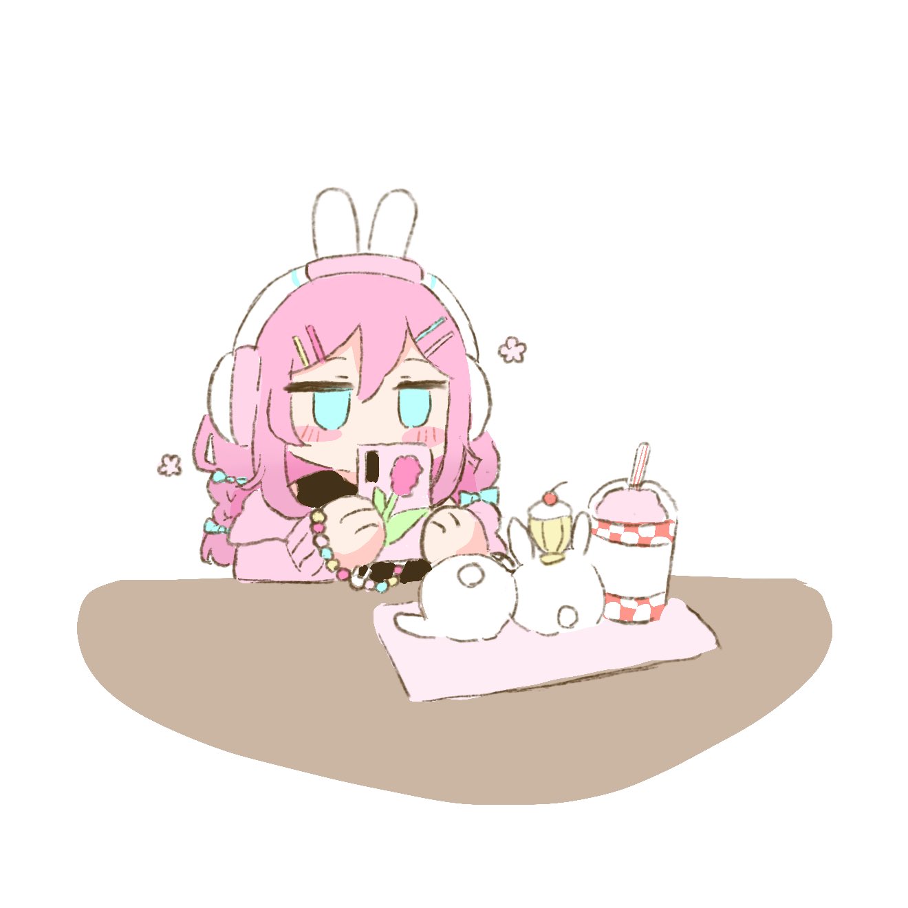 animal_ear_headphones animal_ears aubrey_(omori) blue_eyes cellphone chibi fake_animal_ears hair_ornament hairpin headphones highres mimm_02 multiple_hairpins no_pupils official_alternate_costume omori petals phone pink_hair rose_petals smartphone taking_picture