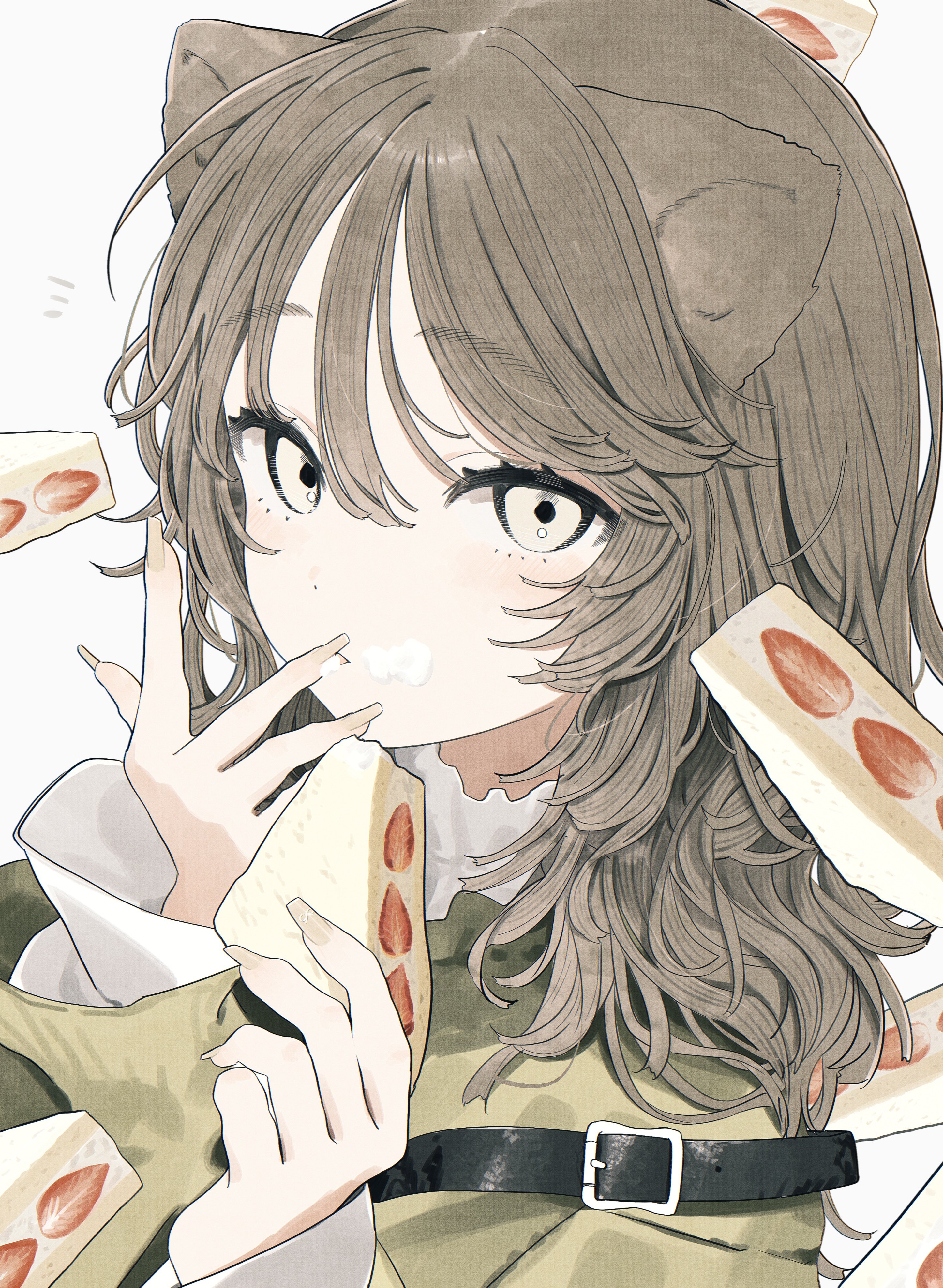 1girl absurdres animal_ears brown_eyes brown_hair cake cake_slice commentary food fruit green_sweater hair_between_eyes highres holding holding_food long_hair long_sleeves looking_at_viewer original pan-chan_(takaya_riku) parted_lips portrait simple_background solo strawberry sweater untranslatable_commentary takaya_riku white_background