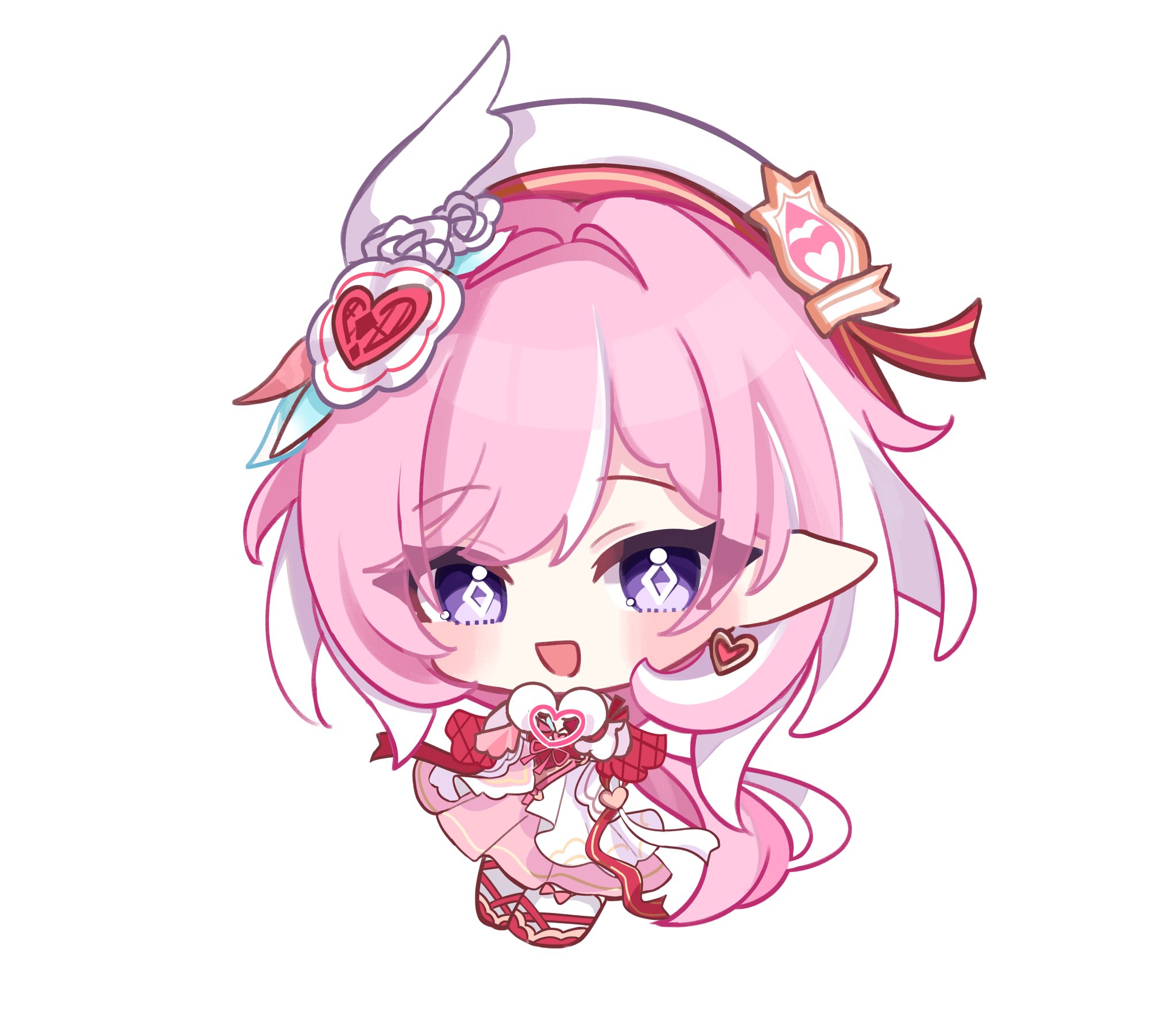 1girl beret chibi chibi_only commentary diamond-shaped_pupils diamond_(shape) dress earrings elf elysia_(hi_love_elf)_(honkai_impact) elysia_(honkai_impact) hat heart heart_earrings heart_hands highres honkai_(series) honkai_impact_3rd jewelry long_hair multicolored_hair pink_dress pink_hair pointy_ears purple_eyes simple_background smile solo untranslatable_commentary symbol-shaped_pupils tdatnst two-tone_dress two-tone_hair very_long_hair white_background white_dress white_hair
