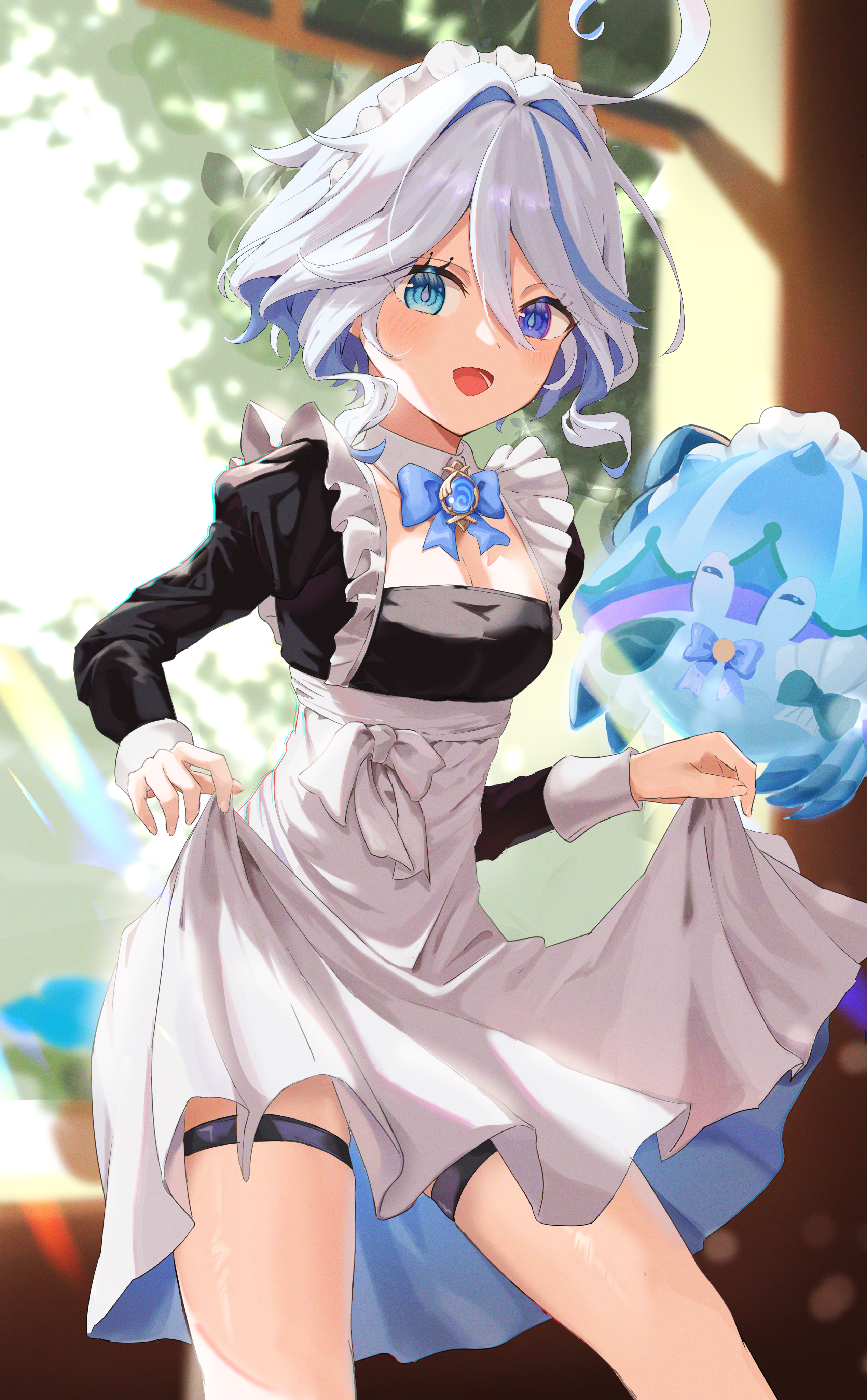 1girl absurdres apron black_dress blue_eyes blue_hair blush clothes_lift commentary dress furina_(genshin_impact) genshin_impact hair_between_eyes heterochromia highres long_sleeves looking_at_viewer mademoiselle_crabaletta maid maid_apron maid_headdress medium_hair multicolored_hair open_mouth short_hair skirt skirt_lift smile solo streaked_hair symbol-shaped_pupils vision_(genshin_impact) white_apron white_hair yukineco_0928
