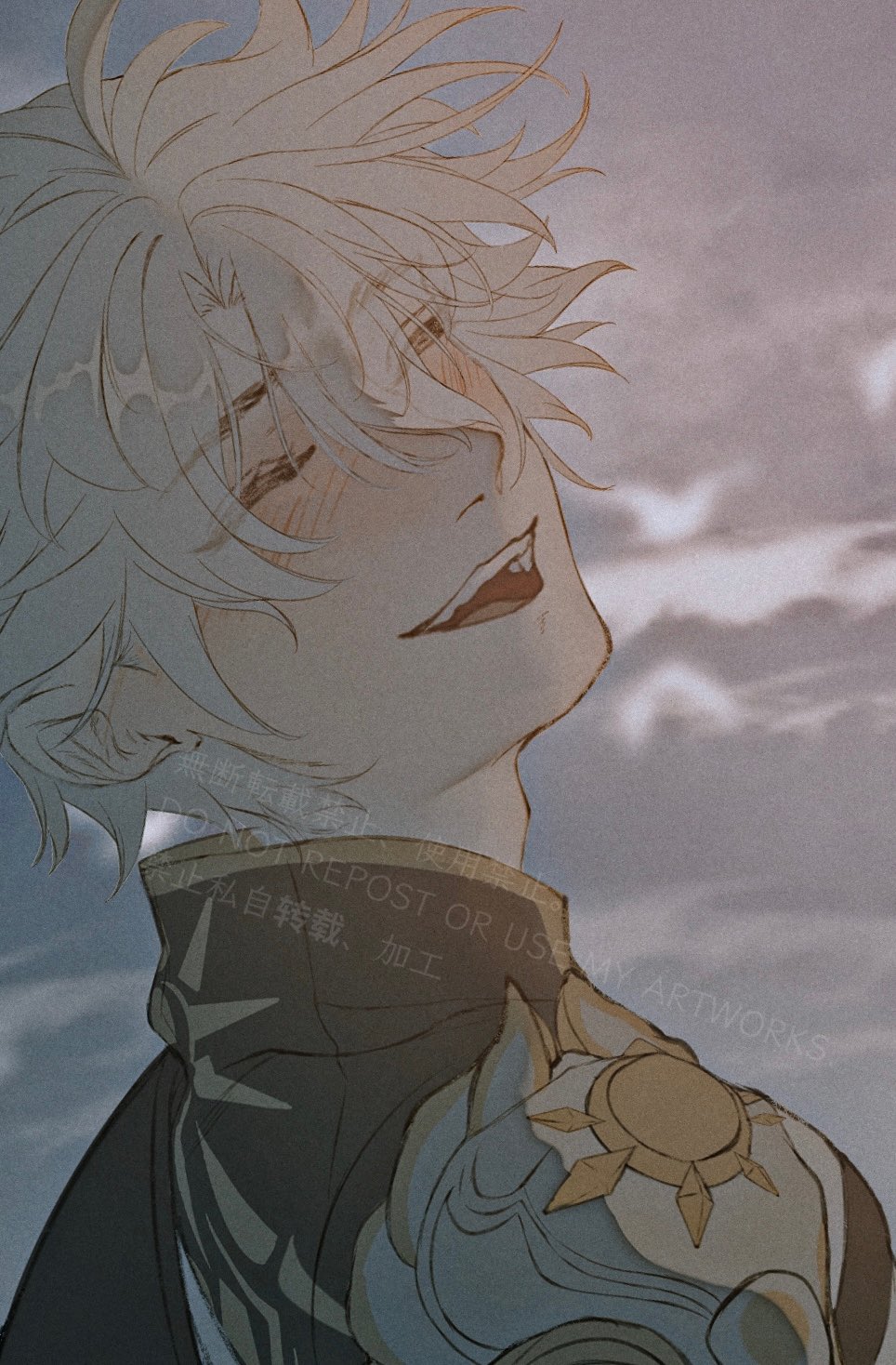 adam's_apple armor black_shirt blush closed_eyes cloud cloudy_sky collared_shirt commentary_request eyelashes hair_between_eyes head_back highres honkai:_star_rail honkai_(series) open_mouth parted_hair pauldrons phainon_(honkai:_star_rail) popped_collar shirt shoulder_armor single_pauldron sky teeth tongue upper_body upper_teeth_only watermark white_hair y9iii1