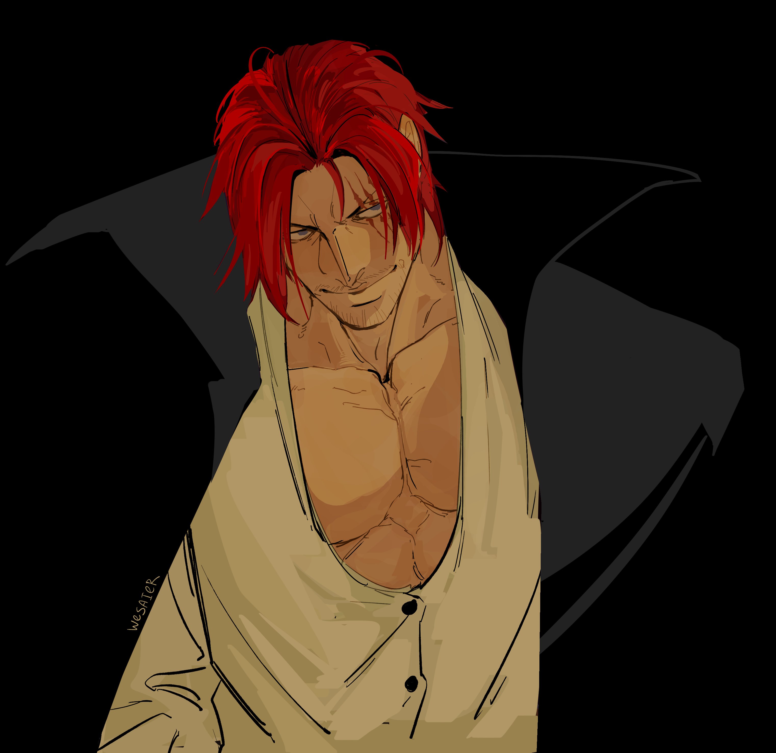 1boy absurdres black_background blue_eyes cape closed_mouth hashtag-only_commentary high_collar highres looking_to_the_side male_focus one_piece red_hair scar scar_across_eye scar_on_face shanks_(one_piece) shirt short_hair signature simple_background smile solo upper_body wesaier white_shirt