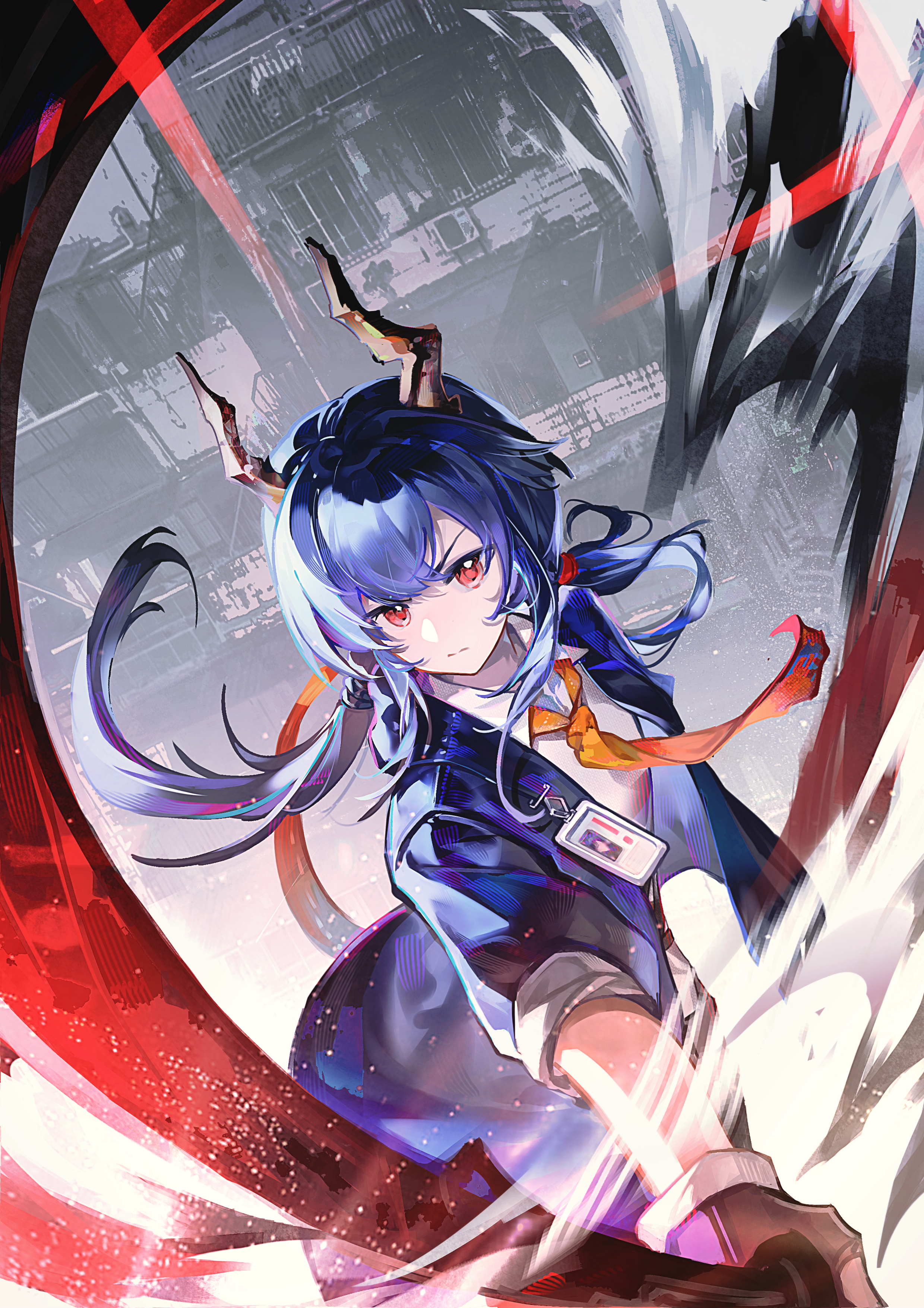 1girl absurdres arknights blue_hair ch'en_(arknights) dragon_horns dynamic_pose fingerless_gloves gloves highres holding holding_sword holding_weapon horns id_card looking_at_viewer low_twintails necktie red_eyes sword twintails weapon yijitaifengdengluluzhou