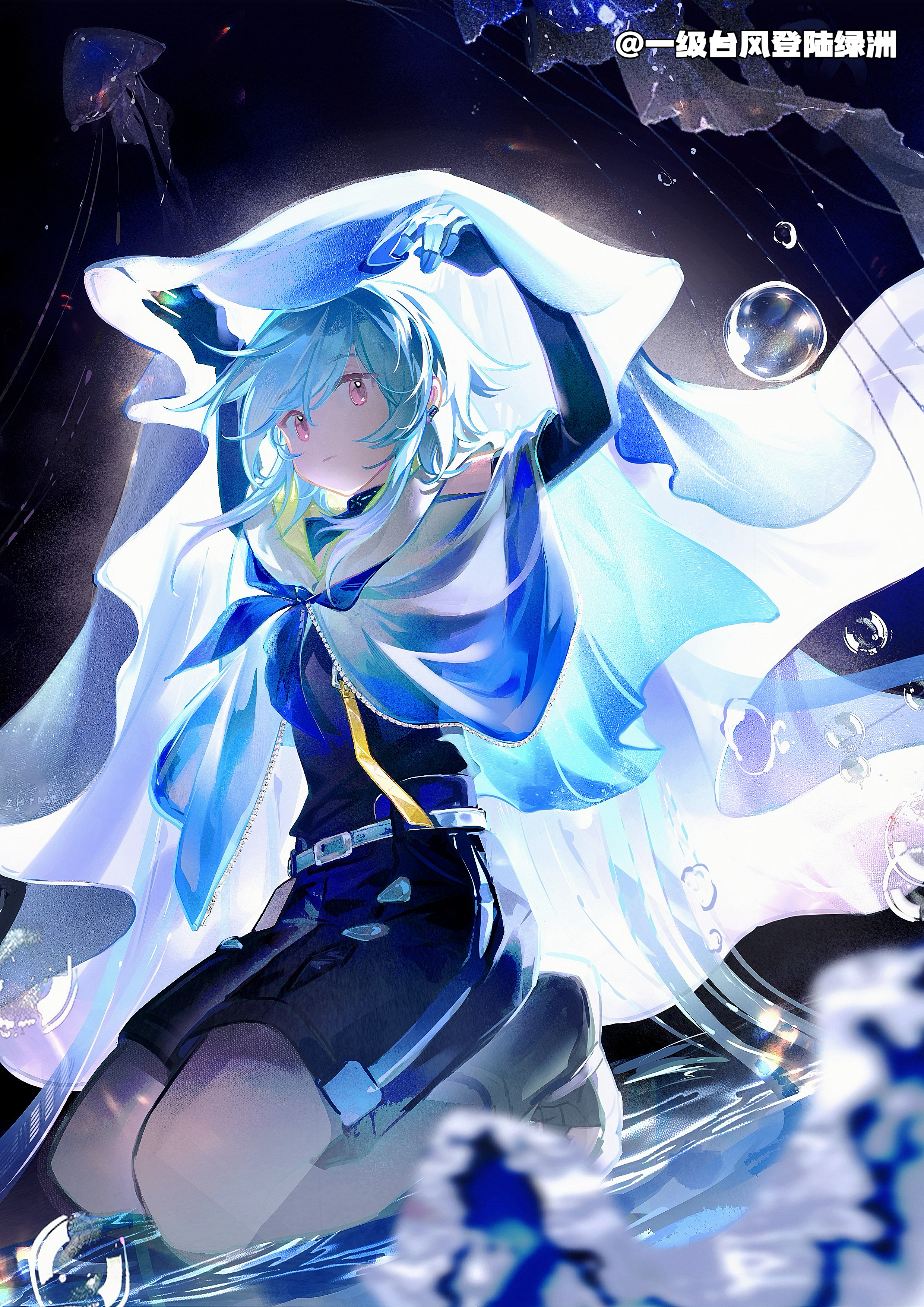 1boy absurdres arknights blue_hair bubble chinese_commentary commentary_request detached_sleeves highres jellyfish kneeling looking_at_viewer male_focus mizuki_(arknights) neckerchief pink_eyes shorts water wind yijitaifengdengluluzhou