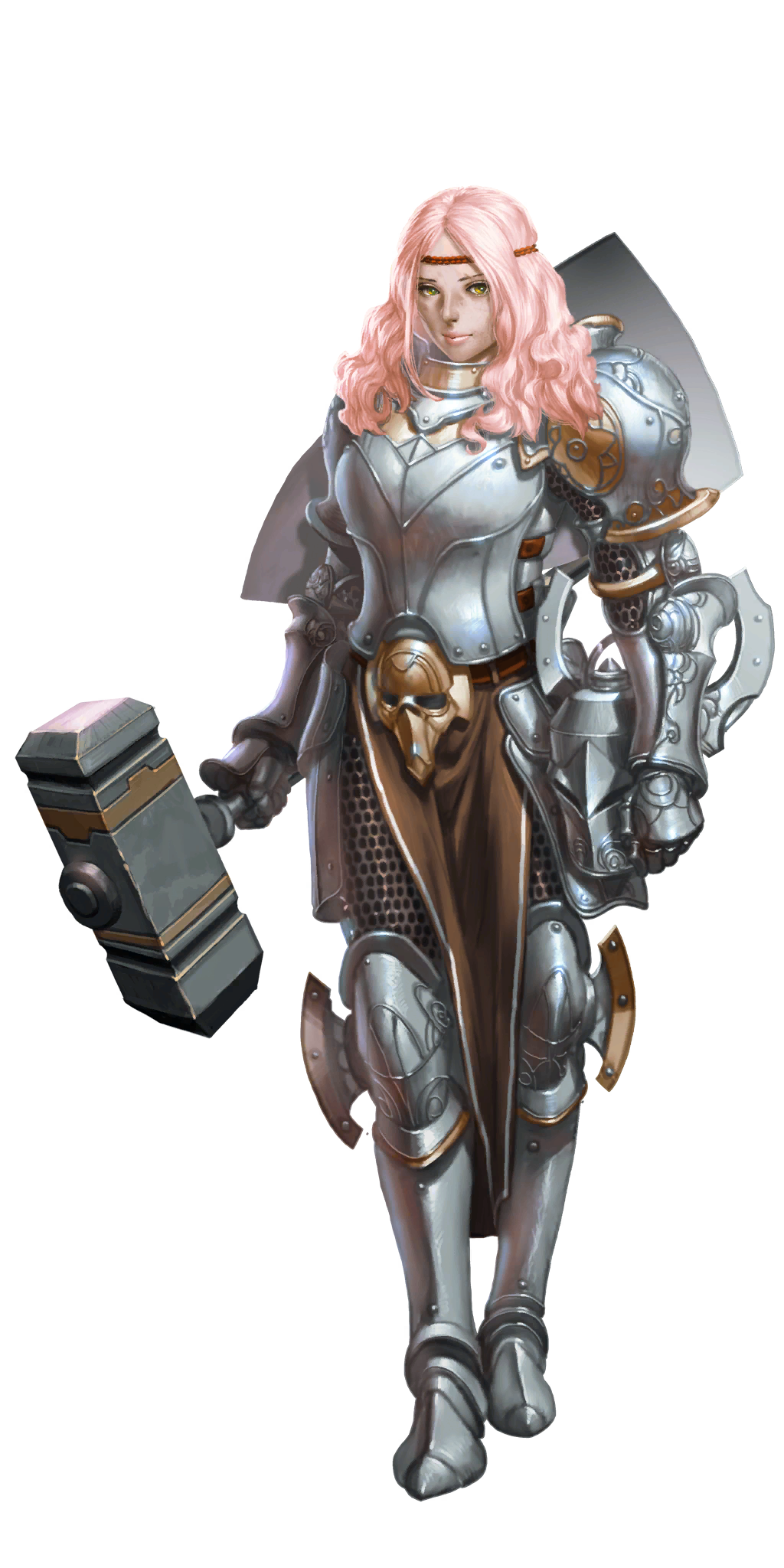 1girl armor artist_request bad_source breasts chainmail closed_mouth crystal_maiden_(series) eli_(crystal_maidens) full_body game_cg hammer highres holding holding_hammer holding_weapon knight official_art pink_hair shield shield_on_back solo transparent_background variant_set weapon yellow_eyes