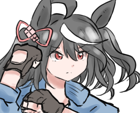 >:( 1girl ahoge animal_ears black_gloves black_hair blue_jacket closed_mouth commentary_request fingerless_gloves frown gloves hair_between_eyes hands_up henshin_pose horse_ears jacket kamen_rider kamen_rider_black kitasan_black_(umamusume) multicolored_hair norippe_(user_zgsf8872) portrait red_eyes simple_background solo streaked_hair two_side_up umamusume v-shaped_eyebrows white_background white_hair