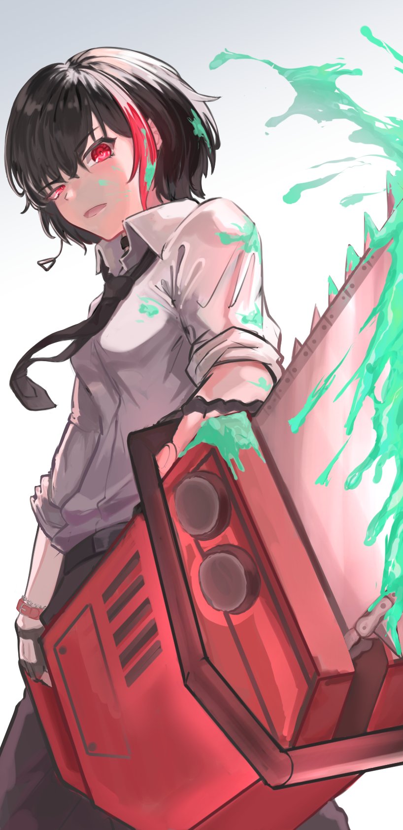 1girl bang_dream! bang_dream!_girls_band_party! black_choker black_gloves black_hair black_necktie black_pants breasts chainsaw chainsaw_man choker collared_shirt commentary cosplay denji_(chainsaw_man) denji_(chainsaw_man)_(cosplay) dress_shirt fingerless_gloves gloves highres holding holding_chainsaw medium_breasts mitake_ran necktie open_mouth pants red_eyes red_streaks shirt short_hair simple_background sleeves_rolled_up solo sunnysalt_08 watch white_background white_shirt wristwatch