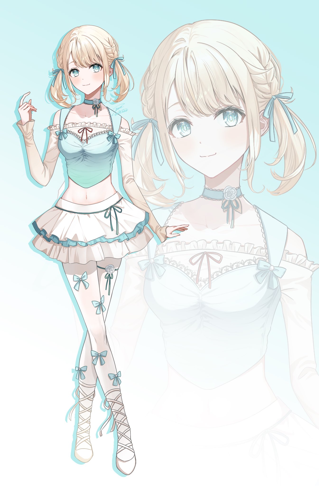 1girl alternate_costume aqua_eyes blonde_hair crop_top full_body highres hololive kazama_iroha layered_skirt long_sleeves looking_at_viewer medium_hair midriff navel pantyhose shirt shoes skirt solo standing virtual_youtuber white_pantyhose white_shirt white_shoes white_skirt zoom_layer zuixiao_yue