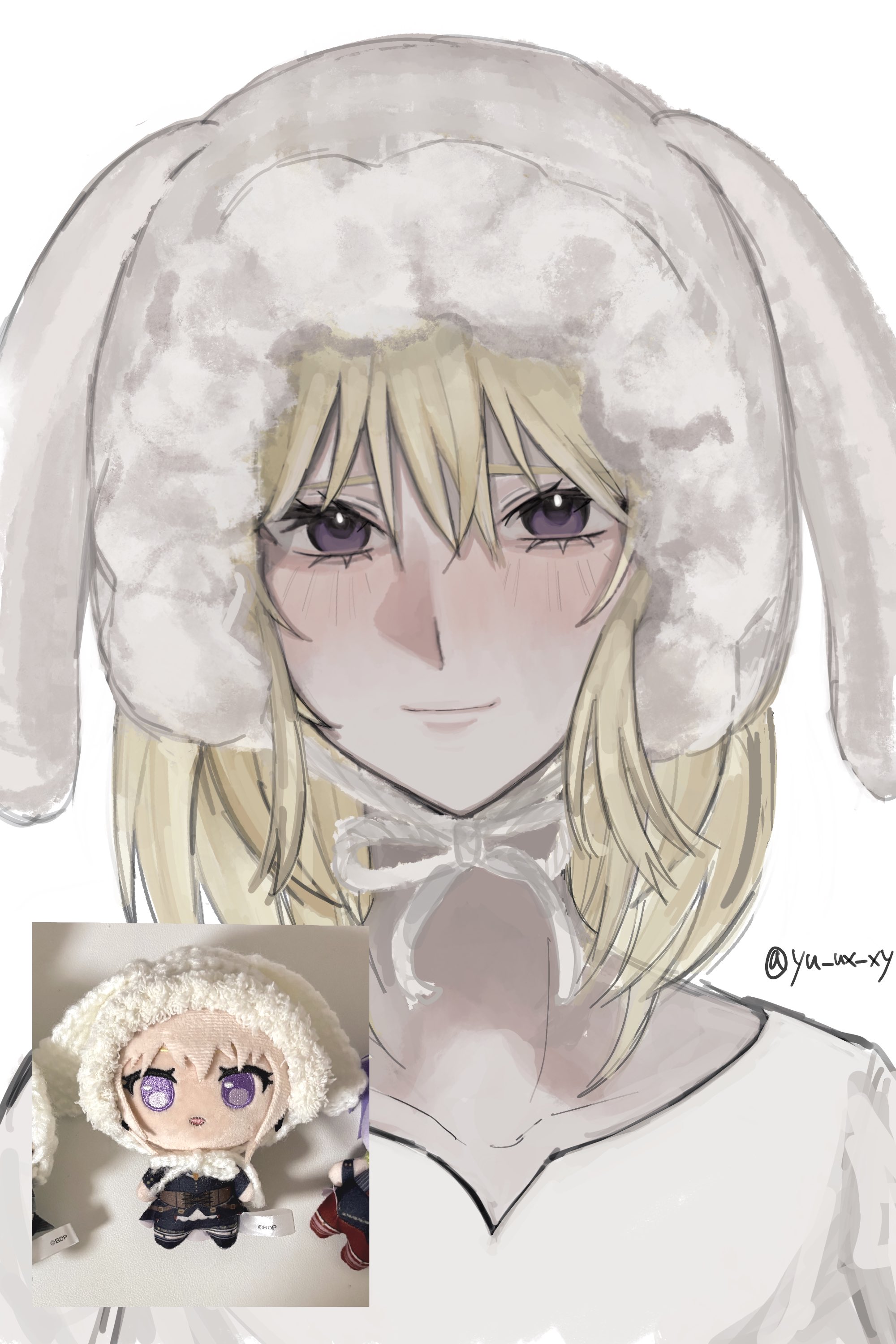1girl absurdres aegyo_sal bang_dream! bang_dream!_it's_mygo!!!!! blonde_hair blush closed_mouth commentary hair_between_eyes hat highres looking_at_viewer medium_hair misumi_uika photo-referenced purple_eyes reference_inset simple_background solo untranslatable_commentary upper_body white_background white_hat yu_ux_xy