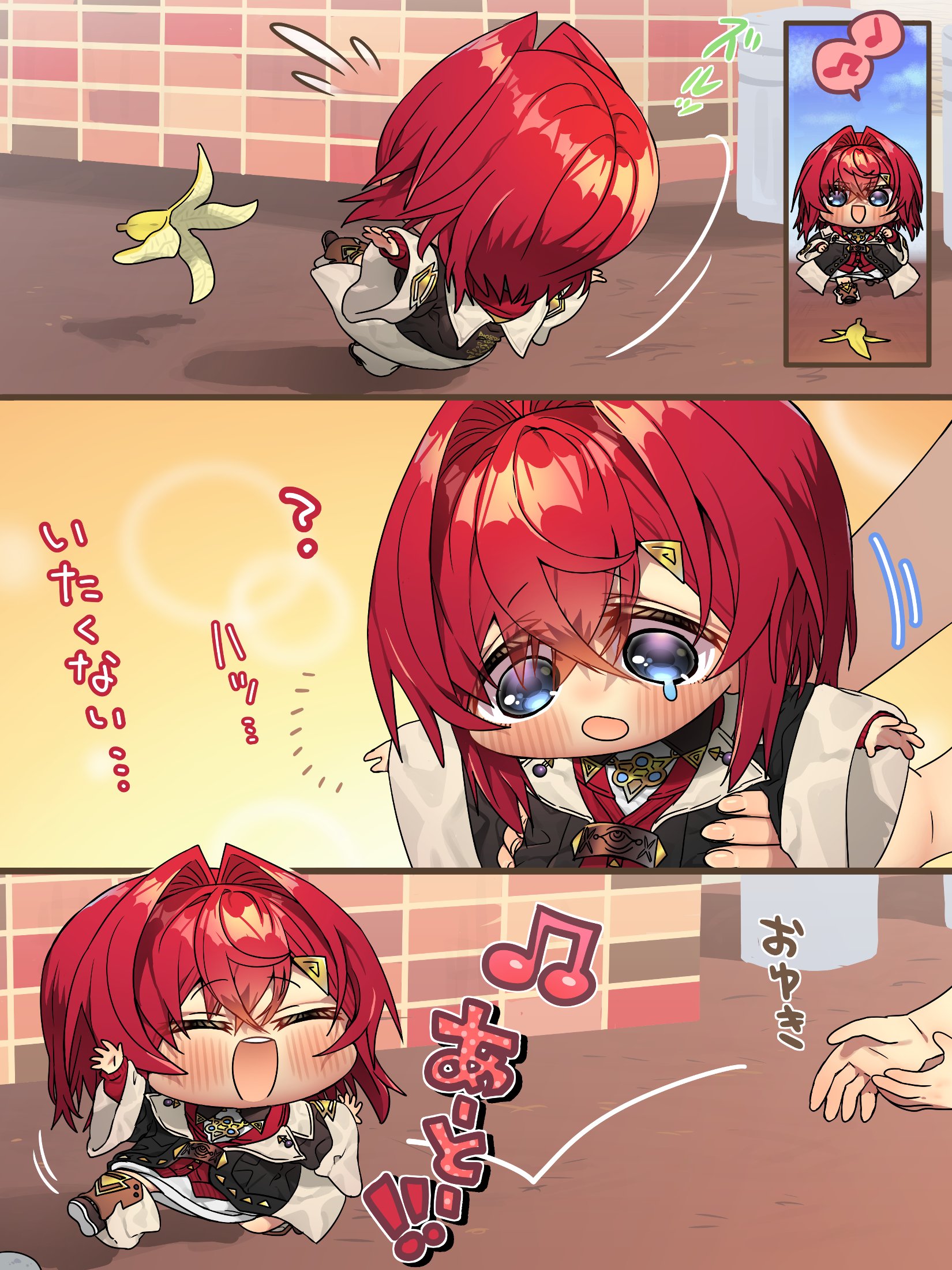 1girl 1other :d ange_katrina banana_peel black_coat blue_eyes blush boots brown_boots chibi chibi_only closed_eyes coat commentary_request crossed_bangs hair_between_eyes hair_ornament harumina_mau highres long_sleeves nijisanji open_mouth red_hair red_shirt shirt short_hair slipping_on_banana_peel smile tears translation_request virtual_youtuber wide_sleeves