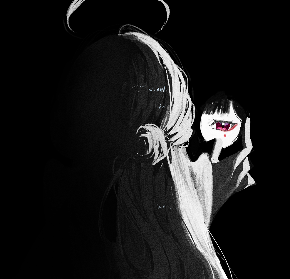1girl black_background bright_pupils circle_facial_mark commentary dark eyeliner facial_mark facing_away from_behind greyscale hair_bun half_up_bun half_updo halo head_wings high_contrast honkai:_star_rail honkai_(series) htt_(user_phhn3327) long_hair makeup mole mole_under_eye monochrome red_eyeliner red_eyes robin_(honkai:_star_rail) single_hair_bun solo sparkle_(honkai:_star_rail) spot_color untranslatable_commentary traditional_halo white_pupils wings