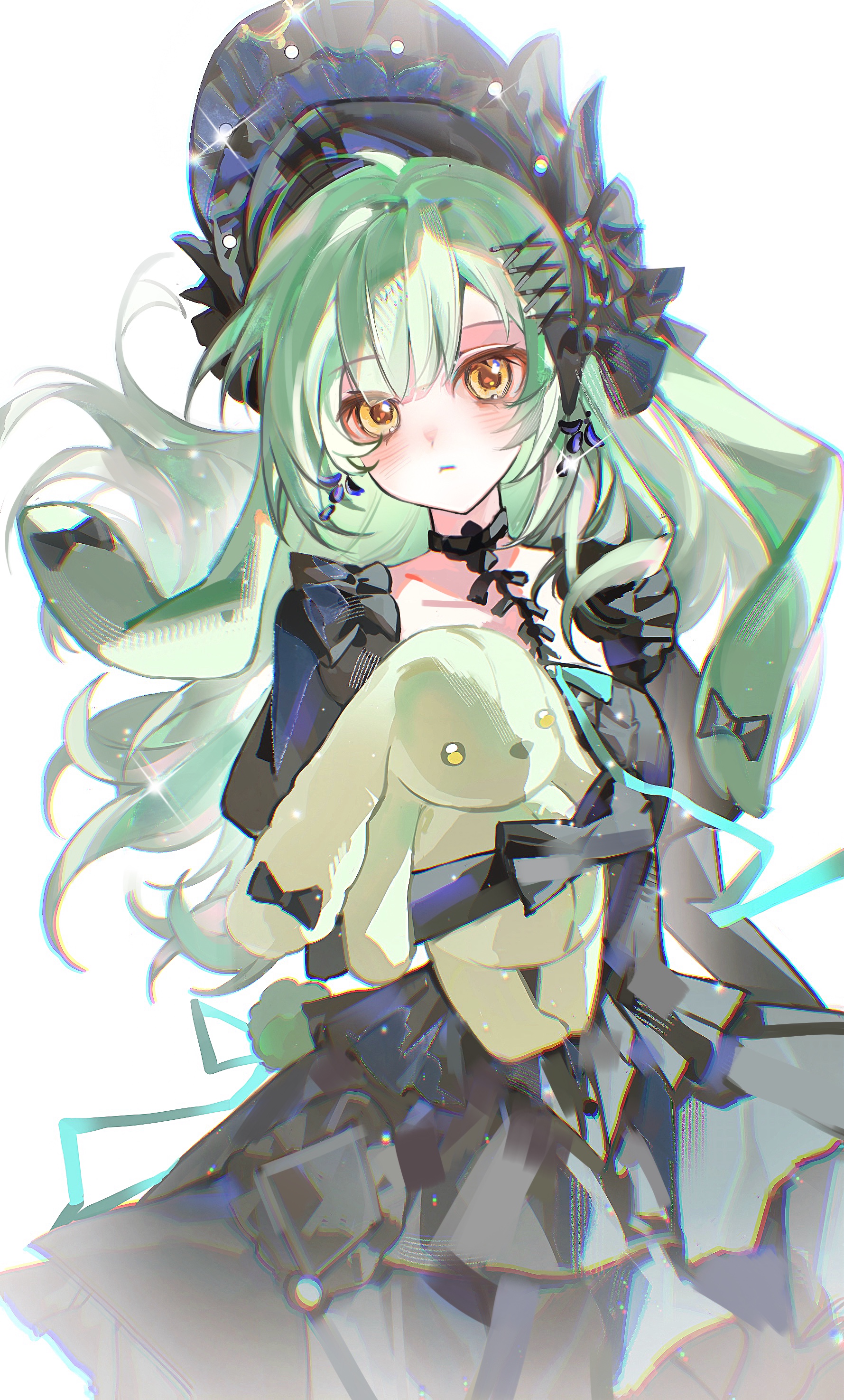 1girl absurdres animal_ears arknights bang_dream! bang_dream!_it's_mygo!!!!! black_bonnet black_bow black_dress black_gloves bonnet bow chromatic_aberration closed_mouth cowboy_shot dress expressionless floppy_ears gloves gothic_lolita green_hair hair_ornament highres holding holding_stuffed_toy lolita_fashion long_hair long_sleeves looking_at_viewer rabbit_ears rabbit_girl sidelocks simple_background solo standing stuffed_animal stuffed_rabbit stuffed_toy wakaba_mutsumi wakaba_mutsumi_(marionette's_id) white_background x_hair_ornament xing_jian_he yellow_eyes