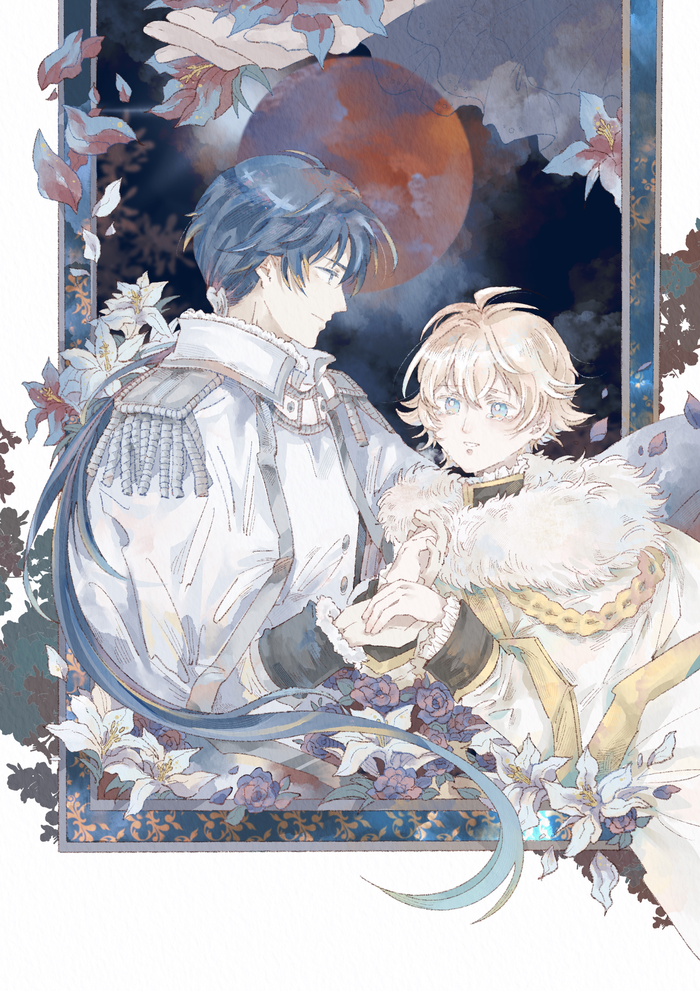 2boys absurdres blonde_hair blue_eyes cape chain epaulettes ewan_juno flower fur_scarf grey_jacket highres holding_hands jacket lawrence_ackroyd long_hair long_sleeves low_ponytail male_focus multiple_boys ninglingzi ponytail shirt short_hair smile the_seven_princes_of_the_thousand-year_labyrinth upper_body very_long_hair white_cape white_shirt
