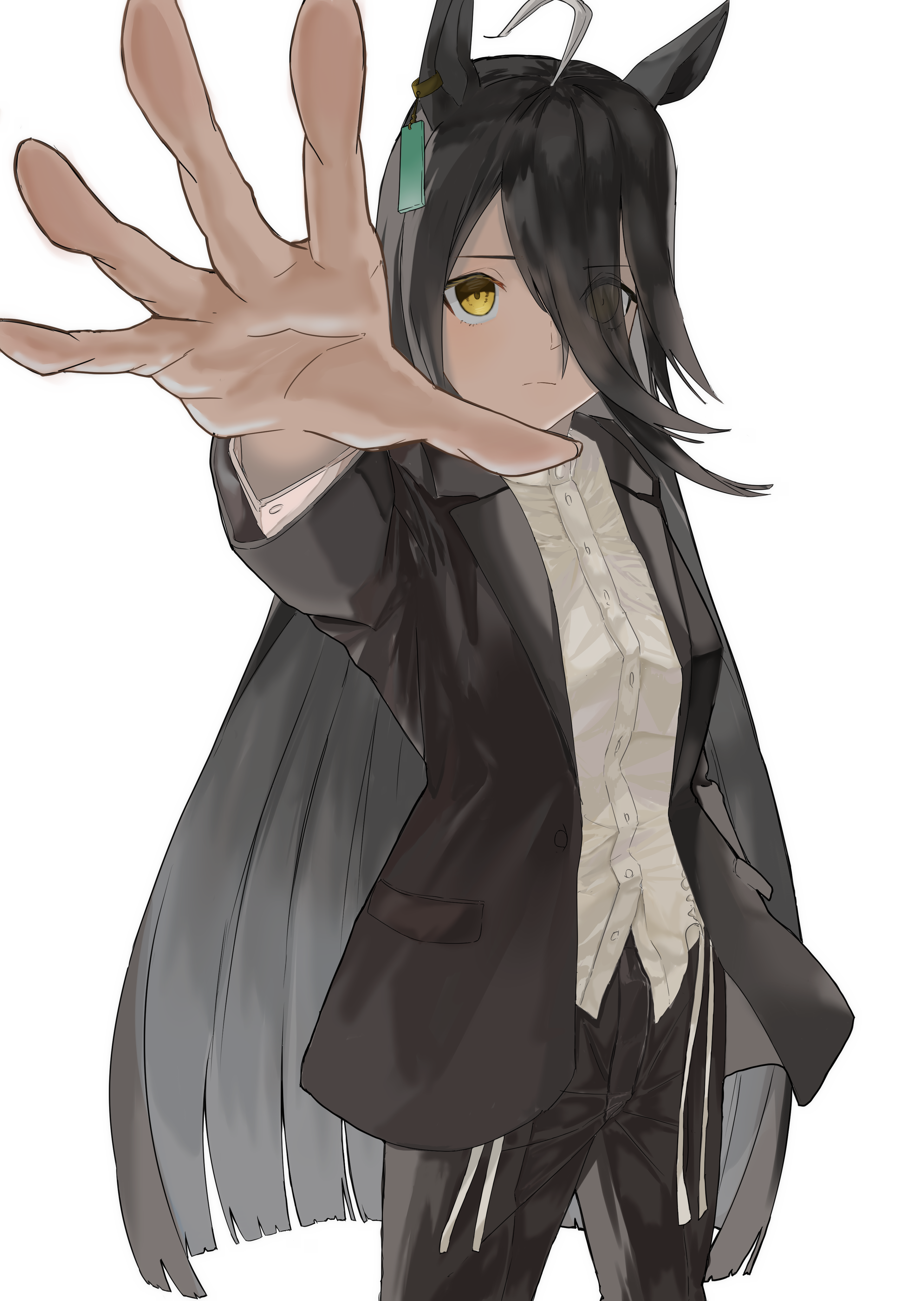 1girl absurdres ahoge animal_ears arm_up black_hair black_jacket black_pants closed_mouth ear_ornament ear_tag earrings eyes_visible_through_hair frown hair_between_eyes hair_over_one_eye highres horse_ears horse_girl jacket jewelry long_bangs long_hair long_hair_between_eyes manhattan_cafe_(umamusume) multicolored_hair open_clothes open_hand open_jacket pants reaching reaching_towards_viewer shiro_kuro_(blackhobby) simple_background single_earring slingshot_swimsuit solo split_mouth swimsuit umamusume very_long_hair white_background white_hair white_slingshot_swimsuit yellow_eyes