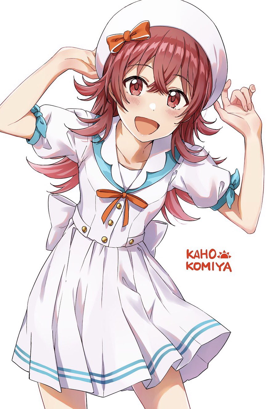 1girl :d adjusting_clothes adjusting_headwear ayano_yuu_(sonma_1426) back_bow beret blue_ribbon blush bow buttons character_name collarbone commentary_request cowboy_shot crossed_bangs dot_nose dress fingernails flipped_hair hands_up hat hat_bow highres idolmaster idolmaster_shiny_colors innocent_sailor_(idolmaster) komiya_kaho long_hair looking_at_viewer neck_ribbon official_alternate_costume open_mouth orange_bow orange_ribbon pleated_dress puffy_short_sleeves puffy_sleeves red_eyes red_hair ribbon sailor_collar sailor_dress short_sleeves simple_background sleeve_ribbon smile solo waist_bow white_background white_dress white_hat