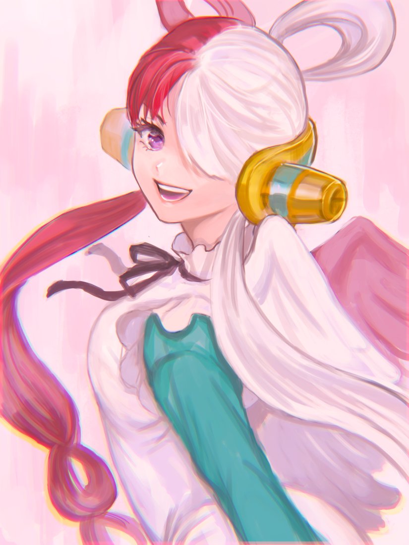 1girl arisue_kanako chromatic_aberration commentary dress elbow_gloves gloves hair_over_one_eye multicolored_hair neck_ribbon one_piece one_piece_film:_red open_mouth pink_wings purple_eyes red_hair ribbon single_elbow_glove smile solo twintails two-tone_hair uta_(one_piece) white_dress white_hair wings