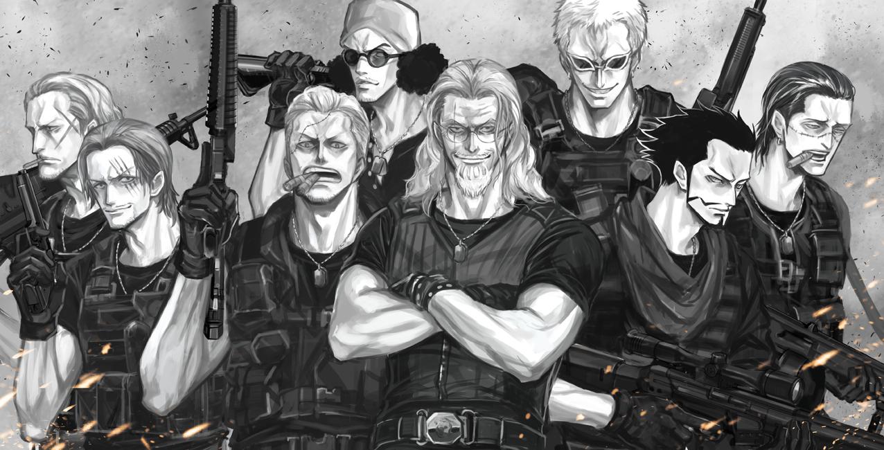 6+boys aokiji_(one_piece) arisue_kanako beard benn_beckman cigar commentary_request crocodile_(one_piece) crossed_arms donquixote_doflamingo dracule_mihawk embers facial_hair glasses gloves greyscale gun hair_slicked_back holding holding_gun holding_weapon jewelry male_focus monochrome multiple_boys mustache necklace one_piece scar scar_across_eye scar_on_face shanks_(one_piece) short_hair silvers_rayleigh smile smoker_(one_piece) stitched_face stitches sunglasses undercut upper_body weapon