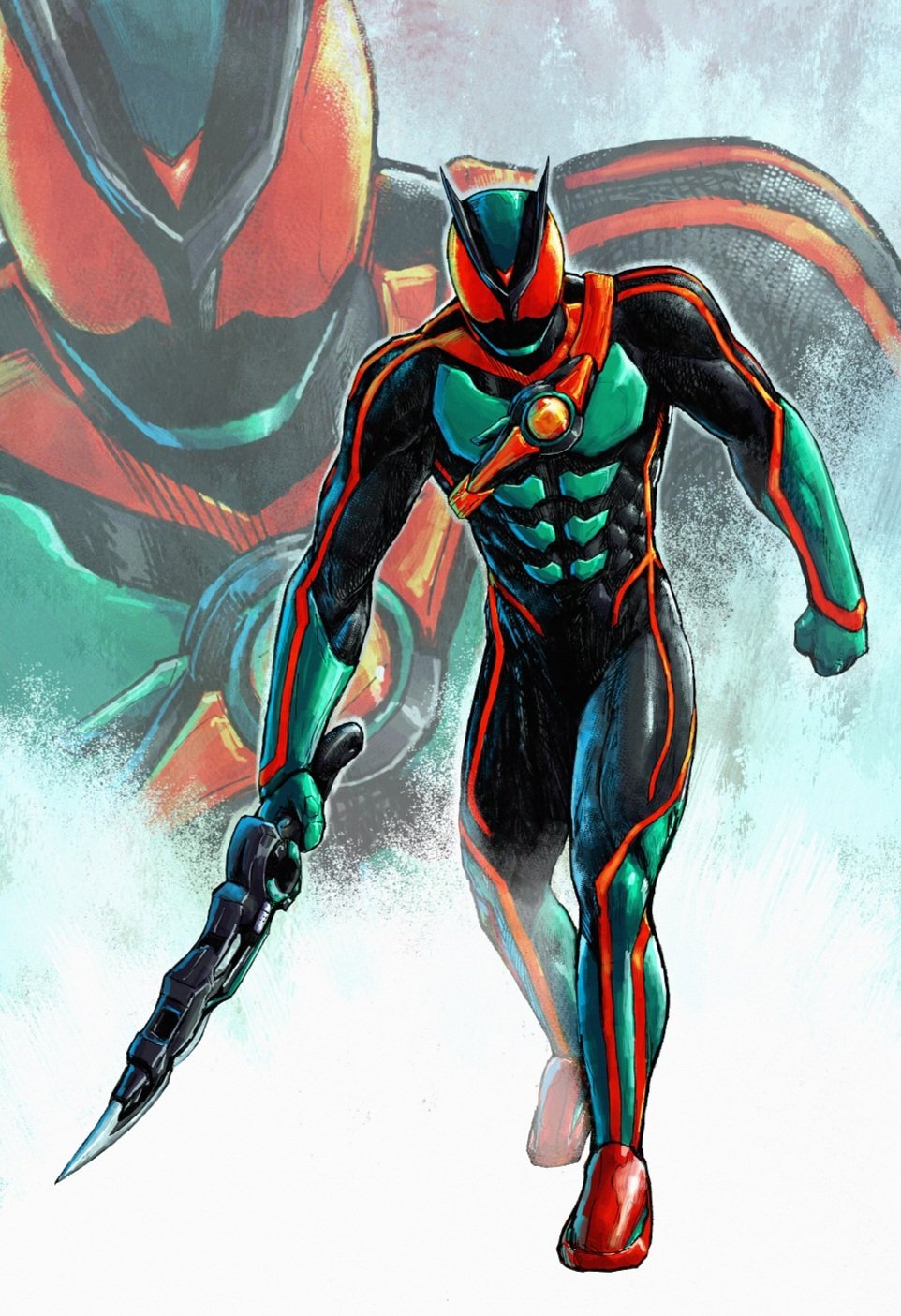 1boy adi_(adivider) black_bodysuit bodysuit full_body highres holding holding_sword holding_weapon kamen_rider kamen_rider_zeztz kamen_rider_zeztz_(series) male_focus red_eyes solo_focus sword tokusatsu weapon zoom_layer