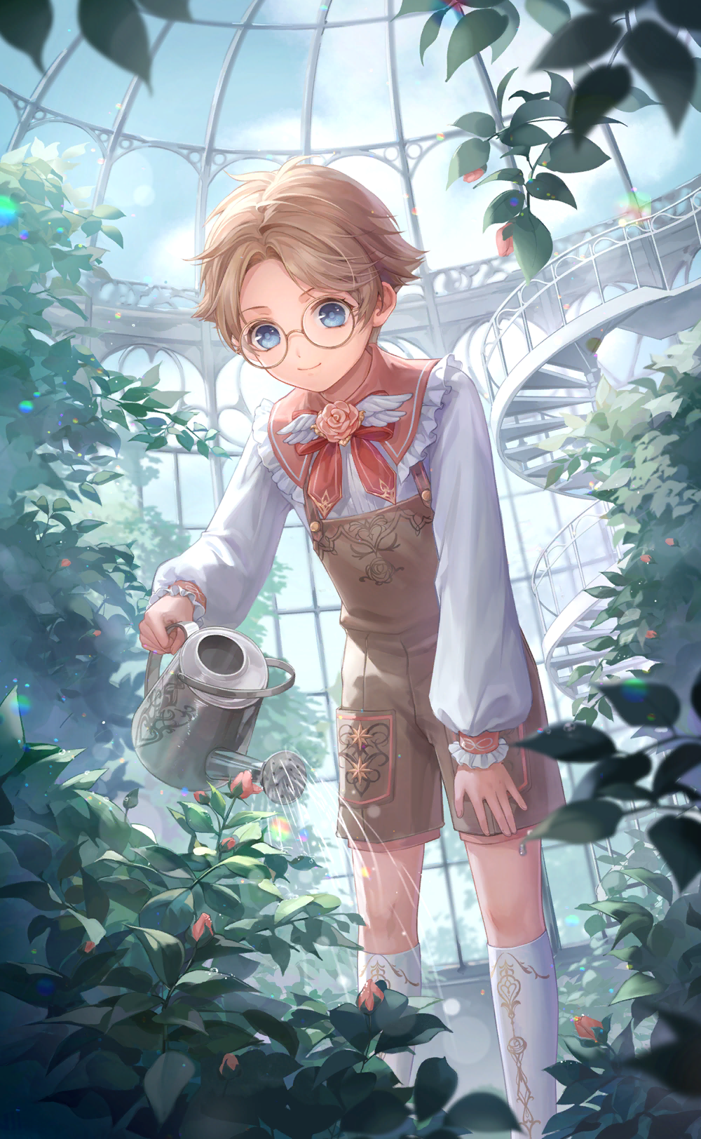 1boy artist_request blonde_hair blue_eyes blue_sky bow bowtie bright_pupils brooch brown-framed_eyewear brown_overalls bud bush buttons capelet child closed_mouth cloud day dot_nose eyelashes feet_out_of_frame fingernails floral_print flower flower_brooch frilled_capelet frilled_sleeves frills game_cg glasses greenhouse hand_on_own_thigh happy highres holding holding_watering_can indoors jewelry kneehighs knees light_particles long_sleeves looking_at_flowers male_focus nikki_(series) official_art overalls pink_capelet pink_flower pink_rose pocket puffy_long_sleeves puffy_sleeves red_bow red_bowtie rose round_eyewear shining_nikki shirt short_hair sky smile socks solo spiral_staircase stairs tareme tree watering_can white_pupils white_shirt white_socks william_(shining_nikki)