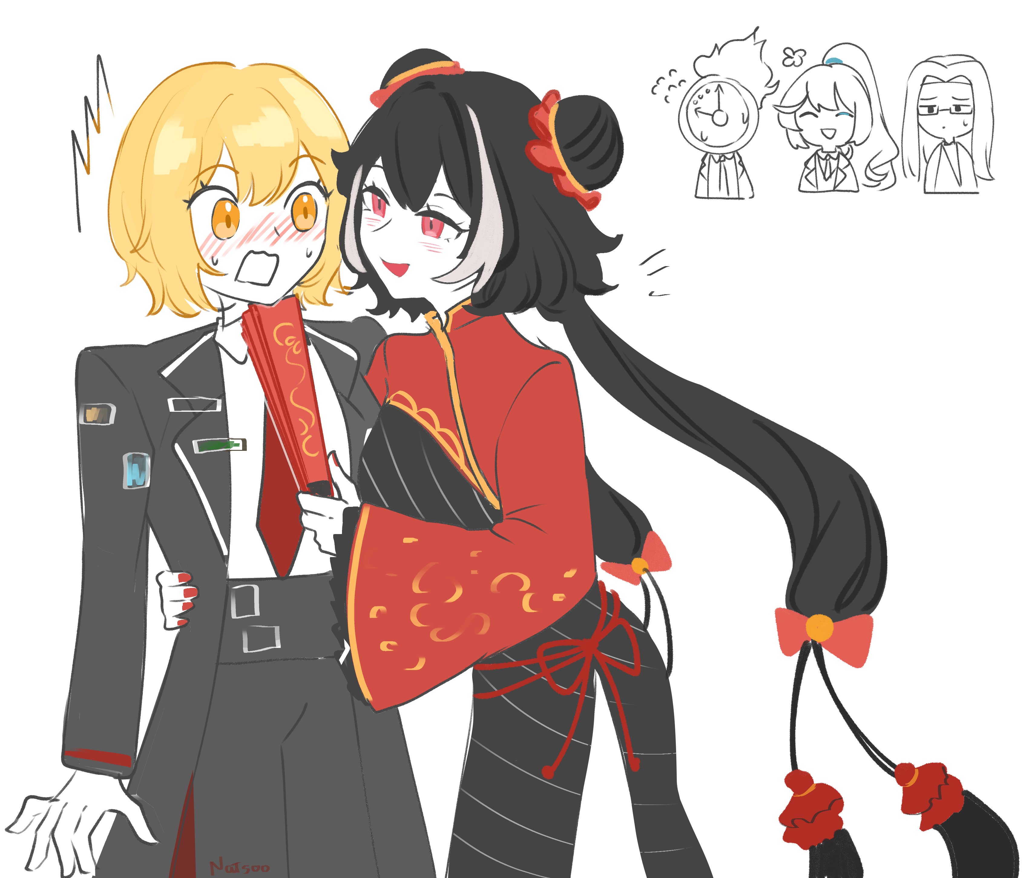 1other 2boys 2girls absurdres black_coat black_dress black_hair black_pants blonde_hair blush chibi chibi_inset chinese_clothes clock coat collared_shirt dante_(limbus_company) don_quixote_(project_moon) double_bun dress hair_bun hand_fan highres hong_lu_(project_moon) jia_xichun_(project_moon) limbus_company long_hair long_sleeves looking_at_another multicolored_hair multiple_boys multiple_girls natsoo_(natsoomeee) necktie open_mouth pants pink_eyes project_moon red_necktie red_shrug rope_belt shirt short_hair shrug_(clothing) simple_background standing streaked_hair twintails upper_body wei_(project_moon) white_background white_shirt white_streaks yellow_eyes