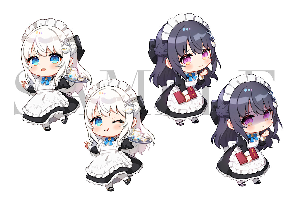 1girl :d apron black_bow black_dress black_hair black_shoes blue_bow blue_bowtie blue_eyes blush bow bowtie chibi chibi_only closed_mouth commentary_request cup cup_hair_ornament dress fork_hair_ornament frilled_apron frills full_body hair_bow hand_up holding holding_menu holding_tray indie_virtual_youtuber juliet_sleeves knife_hair_ornament long_hair long_sleeves looking_at_viewer menu multiple_views nagino_mashiro open_mouth parted_lips pink_eyes puffy_sleeves sample_watermark shaded_face shinishi_chiho shoes simple_background smile socks teacup teapot tray virtual_youtuber watermark white_apron white_background white_hair white_socks