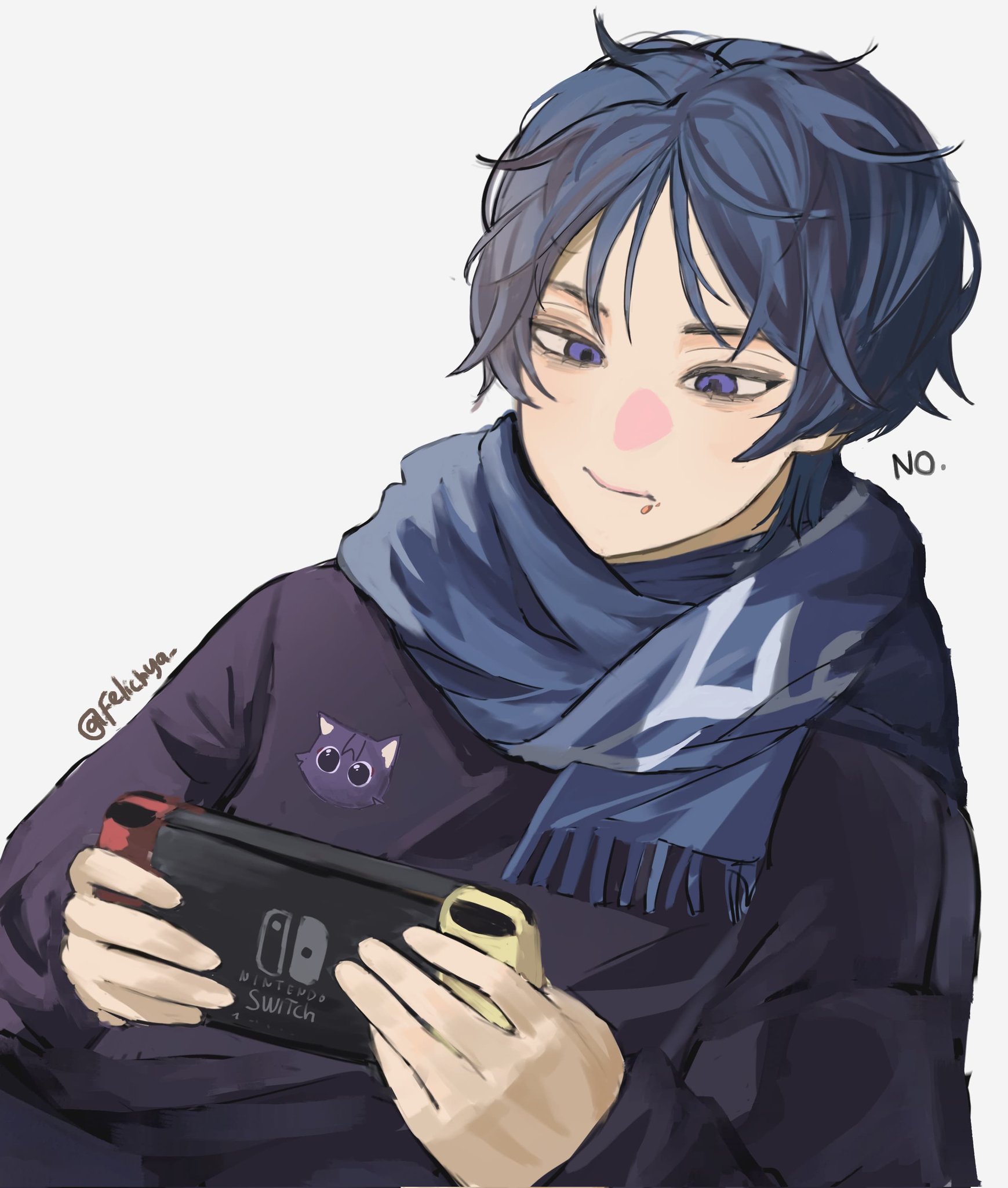 1boy alternate_costume alternate_universe animal_print blue_scarf blunt_ends casual cat_print closed_mouth contemporary english_text food food_on_face fringe_trim genshin_impact grey_hair handheld_game_console highres holding holding_handheld_game_console leaning_to_the_side long_sleeves looking_at_object looking_down lower_eyelashes_only luminfch male_focus nintendo_switch purple_eyes purple_shirt purple_sleeves scaramouche_(cat)_(genshin_impact) scaramouche_(genshin_impact) scarf shirt solo tsurime twitter_username white_background white_trim wispy_bangs