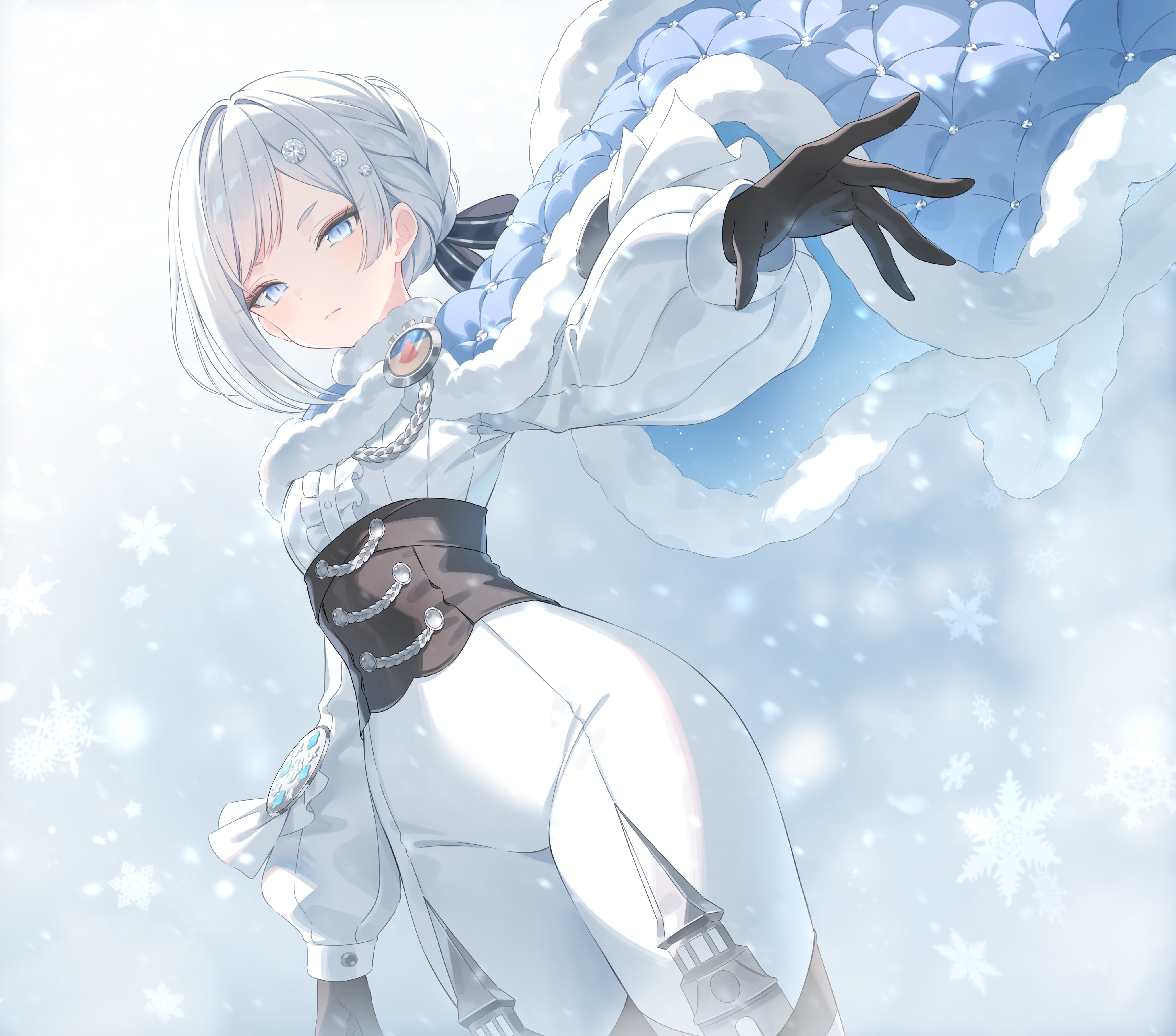 1girl absurdres akershus_fortress_(oshiro_project) badge black_corset black_gloves blue_cape blue_eyes bodysuit braid breasts cape center_frills closed_mouth commentary_request commission corset frilled_shirt frills fur-trimmed_cape fur_trim gloves grey_hair hair_ornament highres long_sleeves looking_at_viewer medium_breasts oshiro_project:re puffy_long_sleeves puffy_sleeves second-party_source shirt skeb_commission snow_is snowflake_background solo swept_bangs tight_clothes white_bodysuit white_shirt